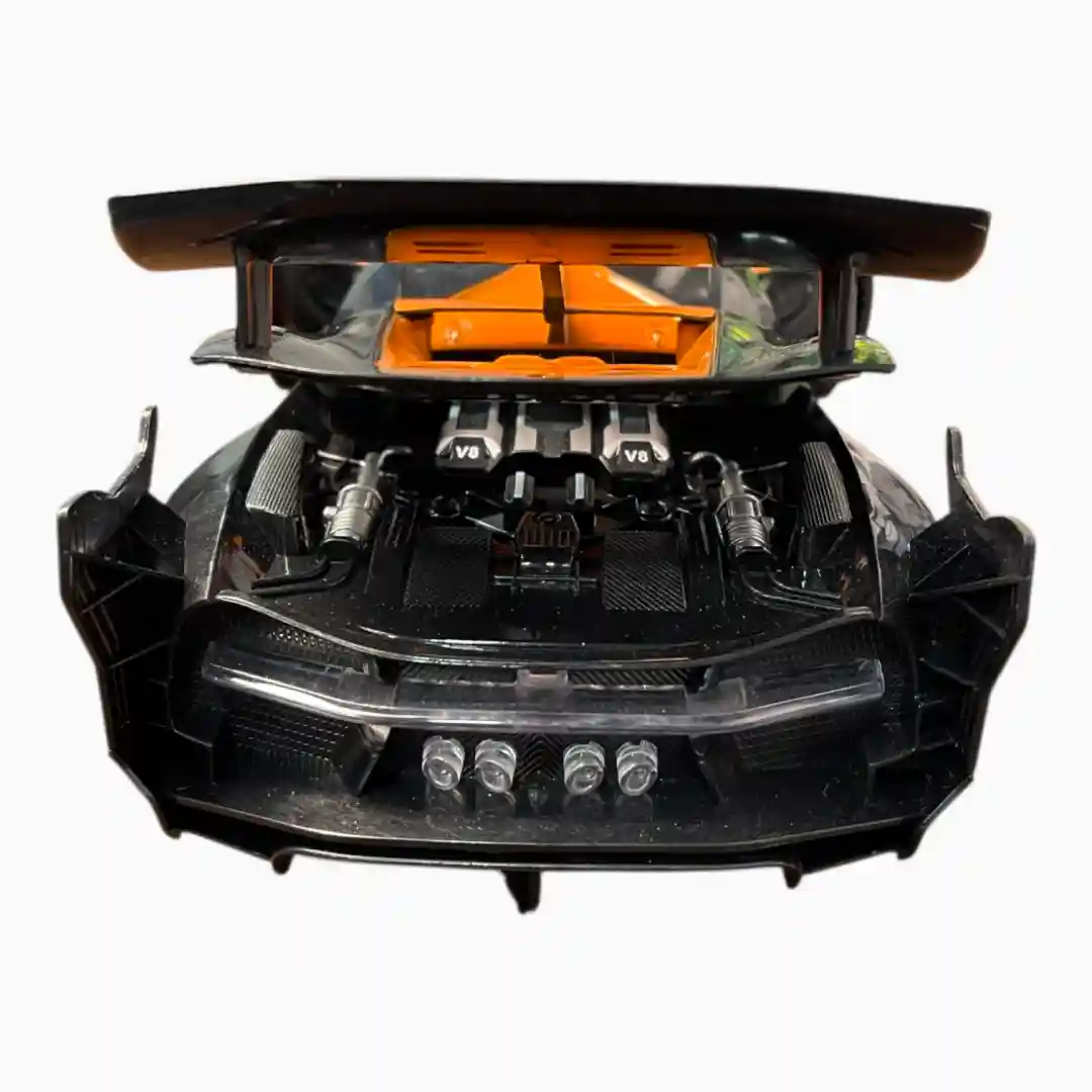 - Diseño: Carrocería deportiva bitono (negro/naranja) con detalles de alto rendimiento (alerón trasero, diseño de motor V8 simulado, rejillas y faros detallados).