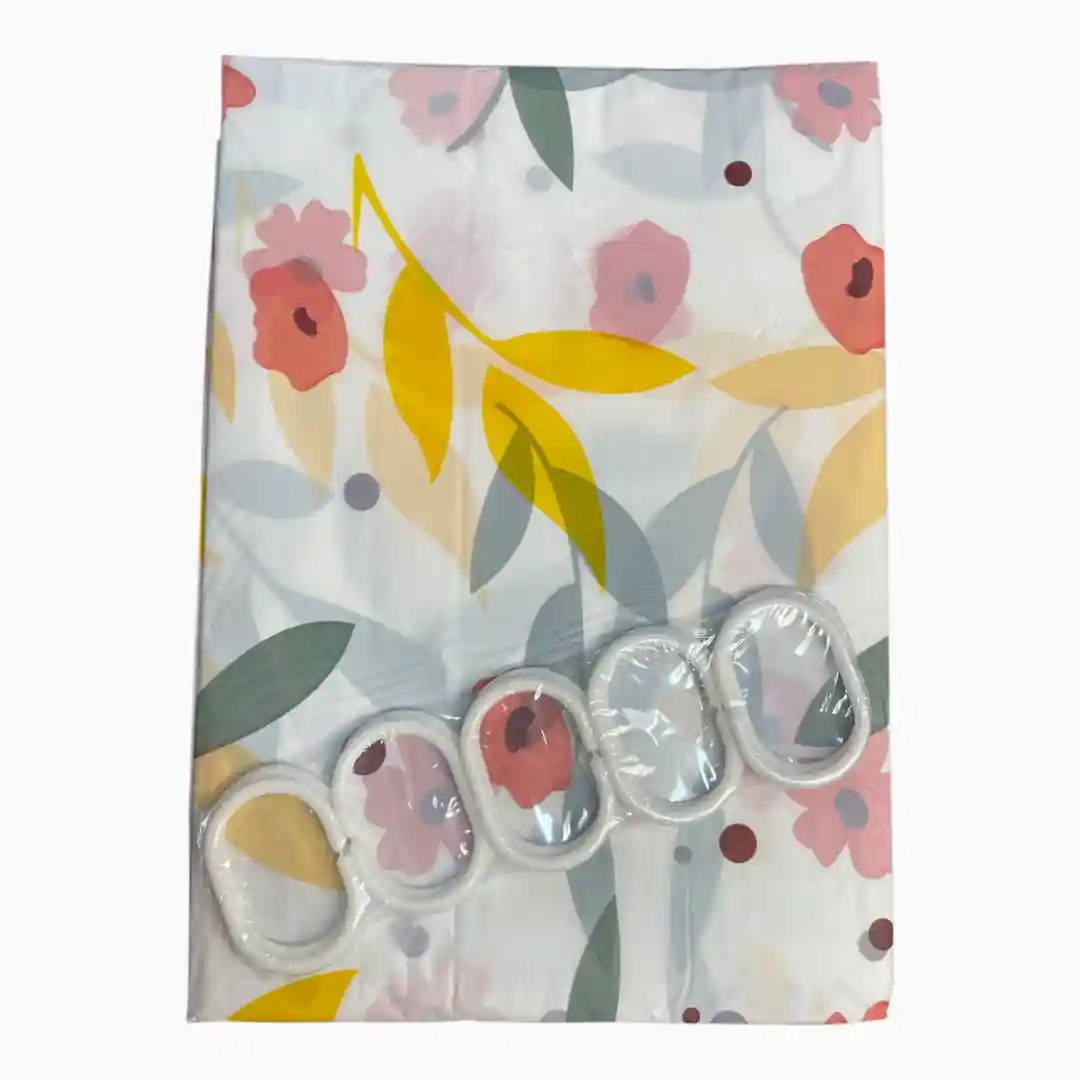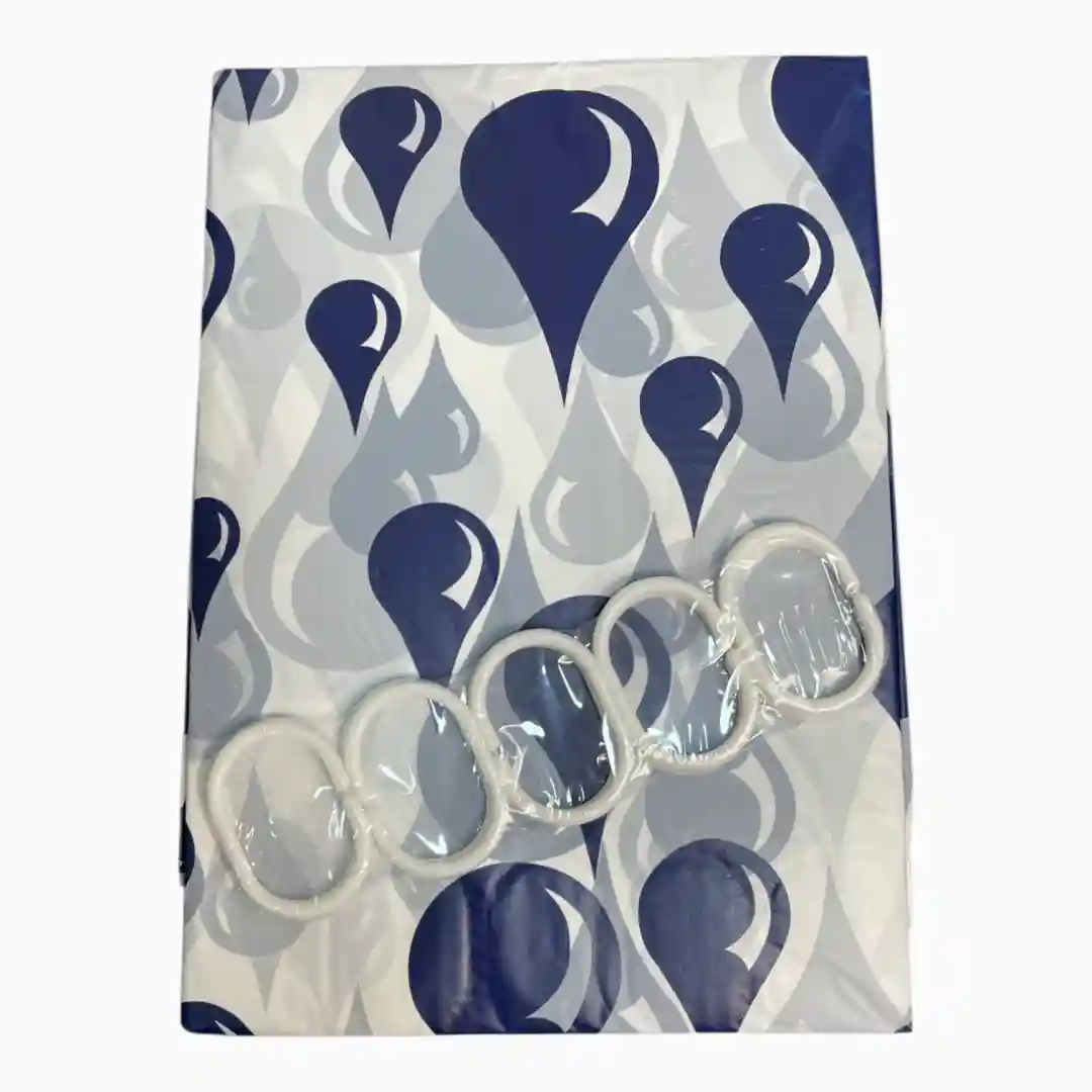 Cortina de ducha impermeable fabricada en material plástico (PEVA/PVC), de fácil limpieza y alta resistencia al agua. Se presenta en un set completo con diseños modernos y variados, lista para su instalación inmediata.