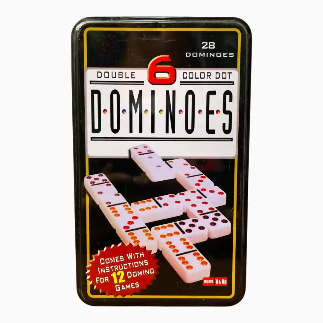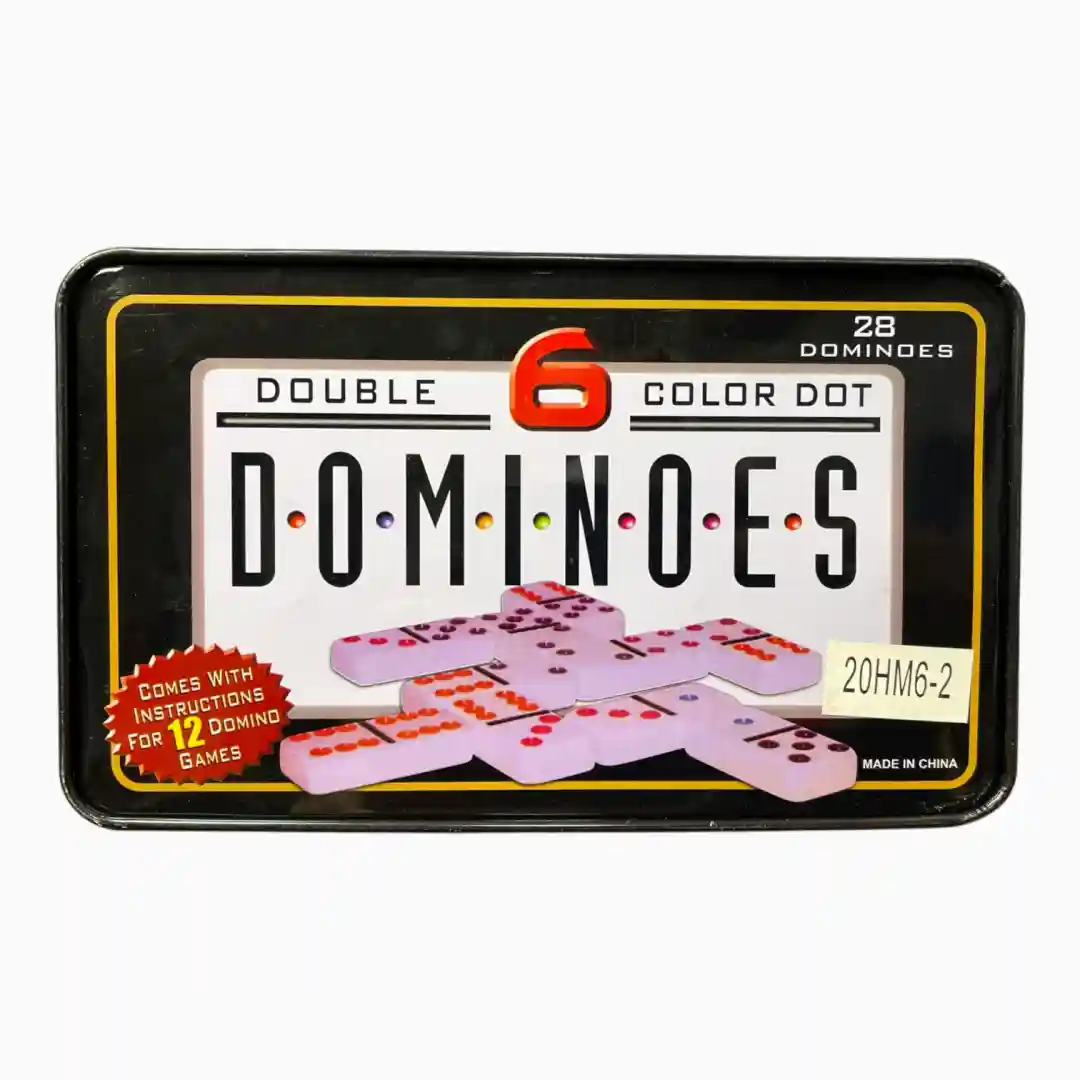 • Identificación: La tapa destaca claramente el DOUBLE 6, 28 DOMINOES y la indicación de COLOR DOT, resaltando las principales características.