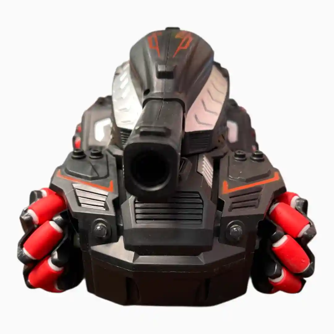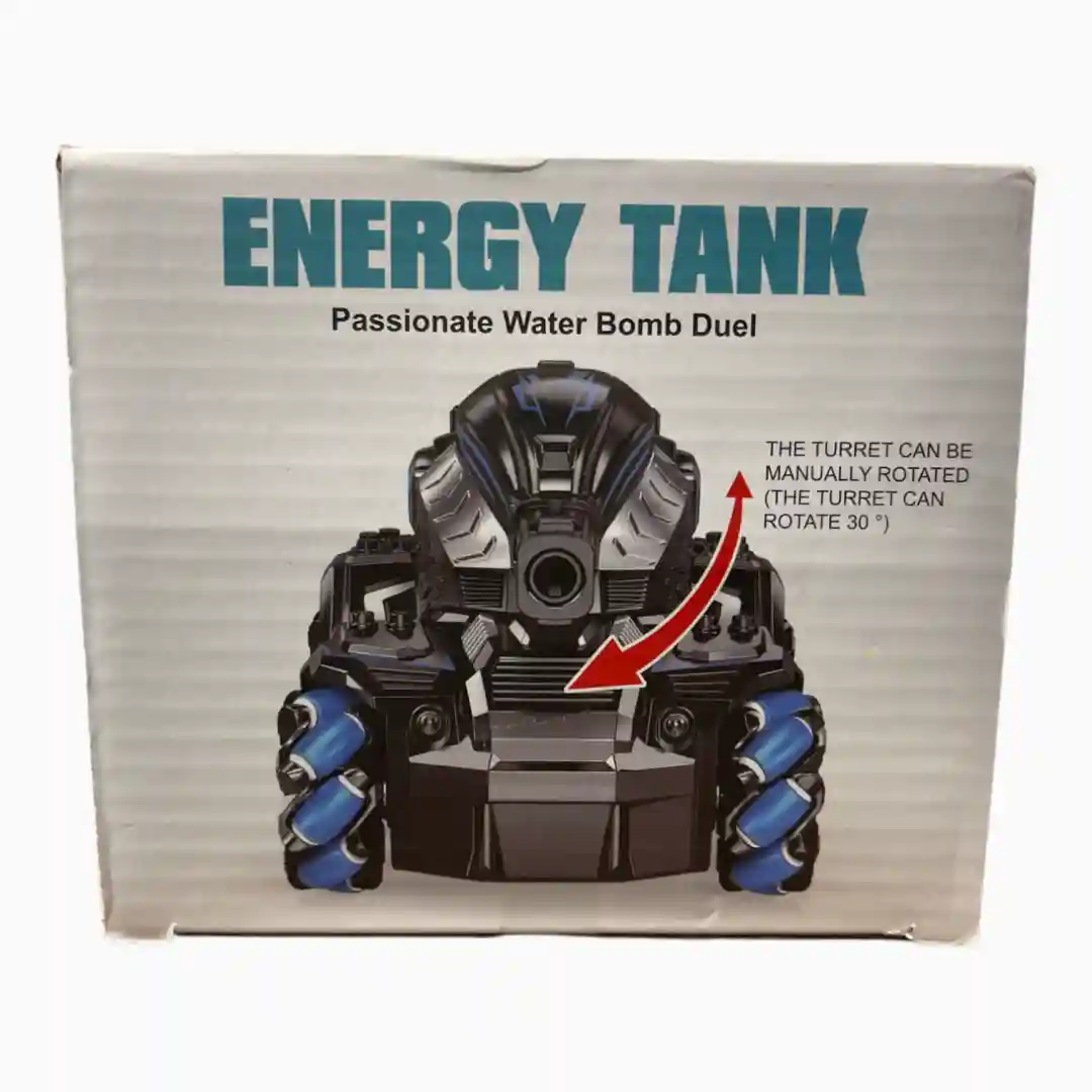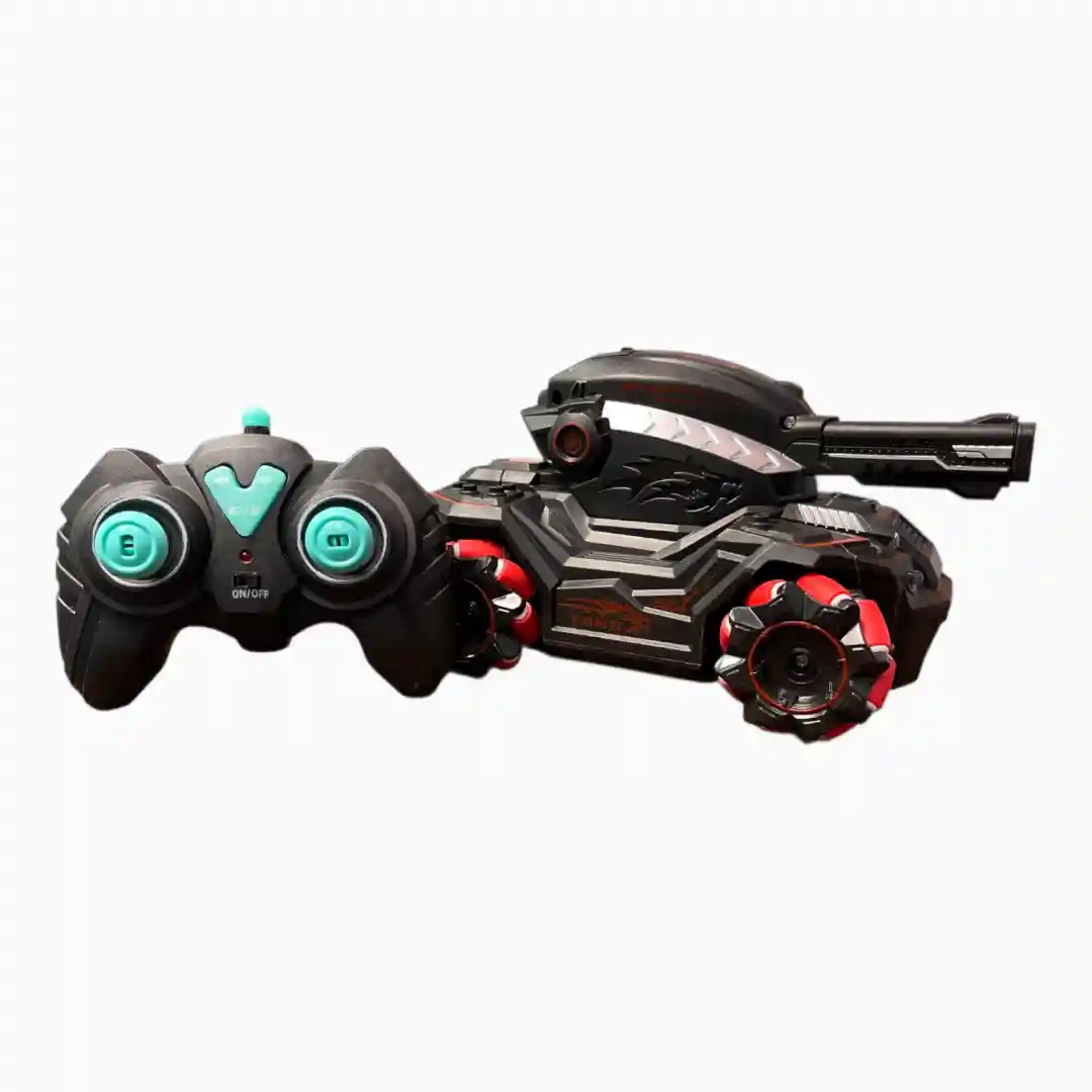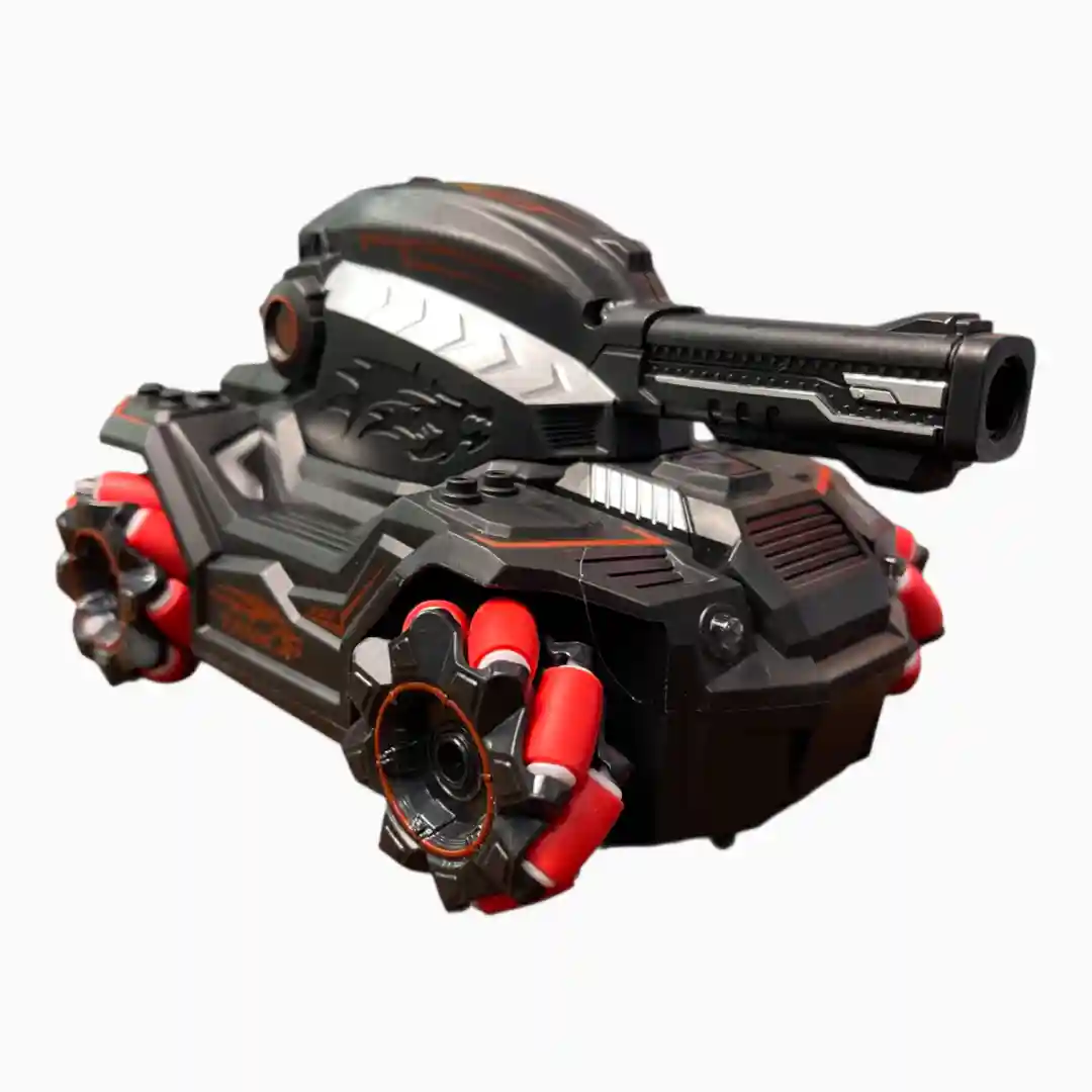 Vehículo de control remoto tipo tanque de diseño futurista con un sistema de 6 ruedas omnidireccionales (Mecanum Wheel) que permite movimientos acrobáticos laterales y rotatorios. Equipado con una torreta lanzadora de bolas de hidrogel («Water Bomb Duel») para juegos de combate interactivos.