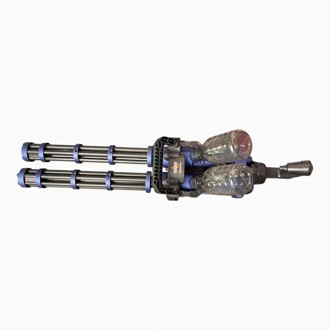 - Diseño: Modelo de doble cañón giratorio (Gatling), color principal azul/negro.