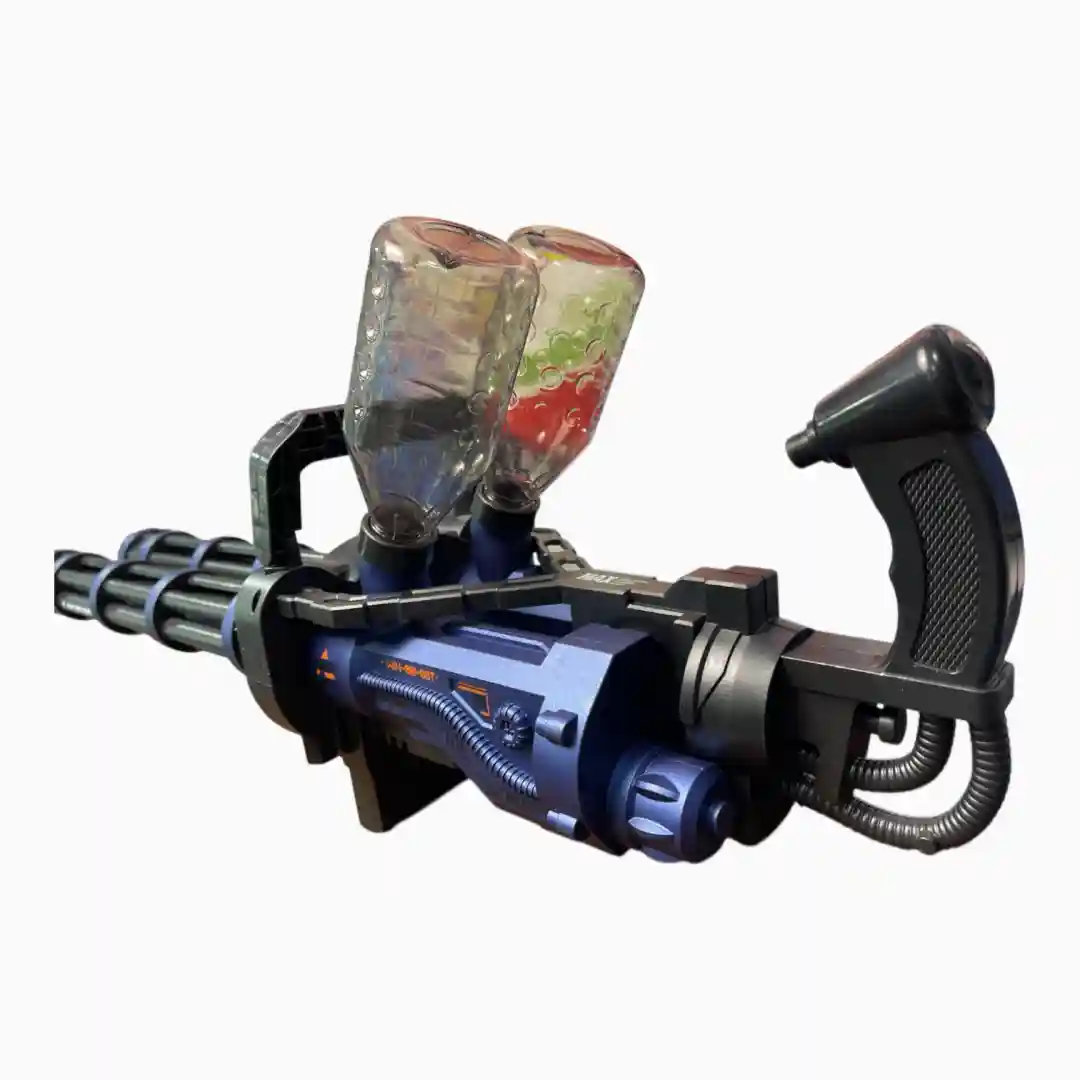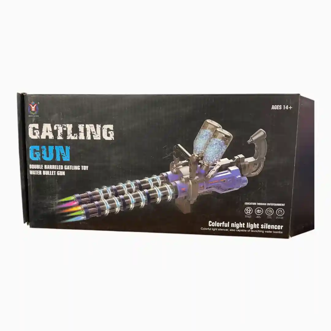 Juguete lanzador de bolas de gel tipo minigun/Gatling de doble cañón, diseñado para ofrecer una experiencia de juego dinámica y visualmente impactante, destacando por su sistema de iluminación LED nocturna.