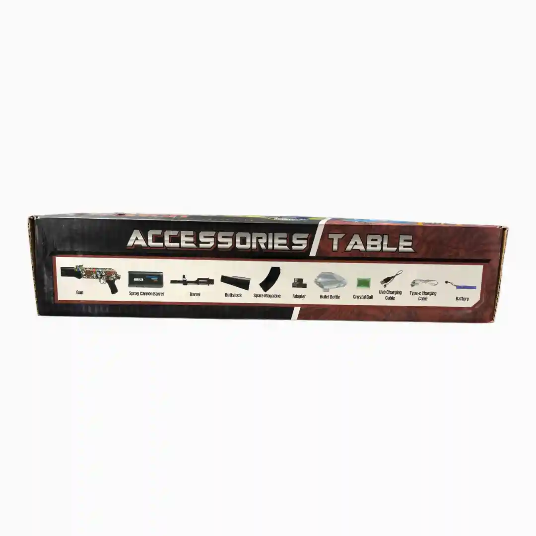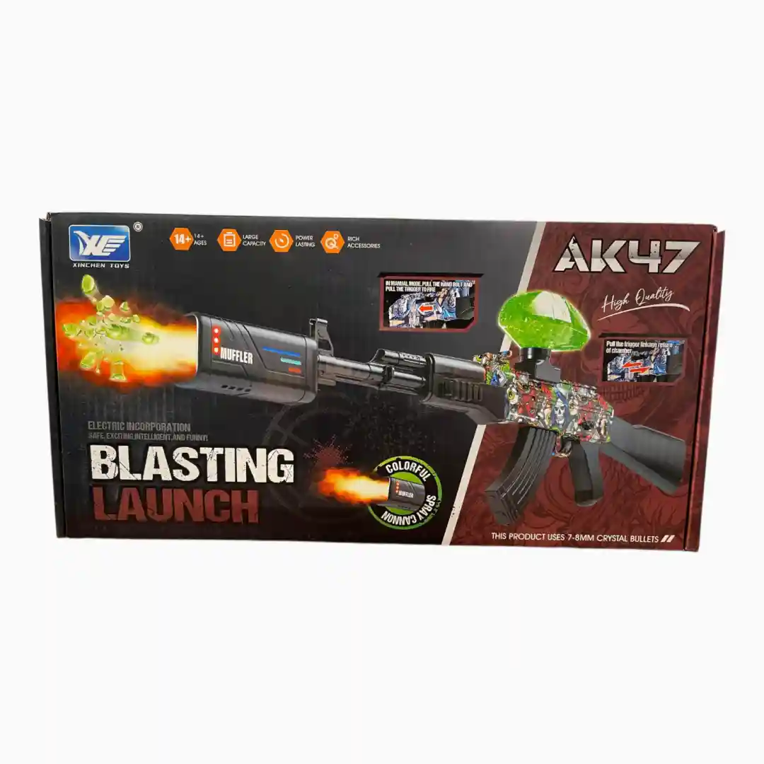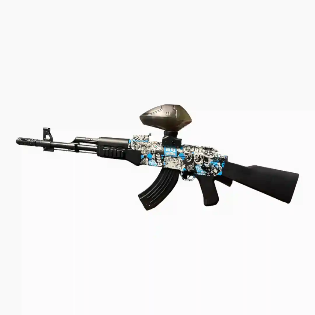 Réplica de juguete de fusil AK-47 con diseño de graffiti/calcomanías, operada eléctricamente para el lanzamiento automático de bolas de gel. Incorpora un accesorio de cañón «Muffler» multifuncional y un sistema de alimentación superior por tolva.