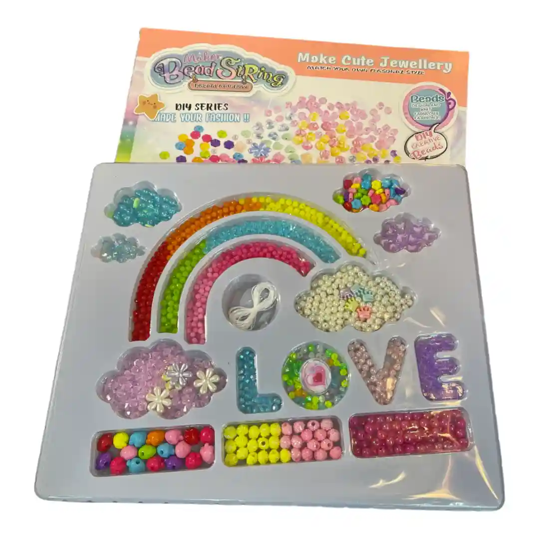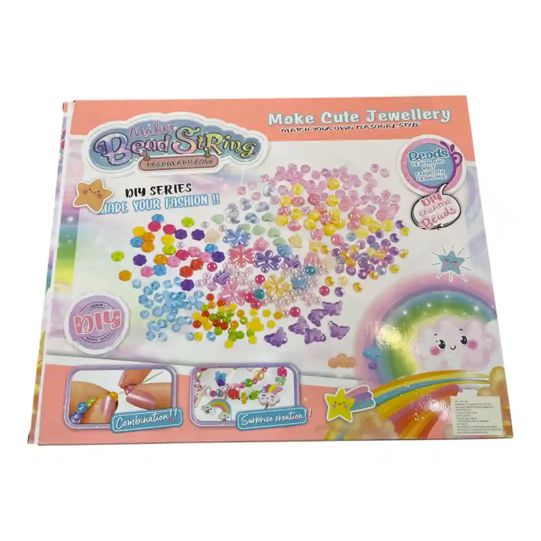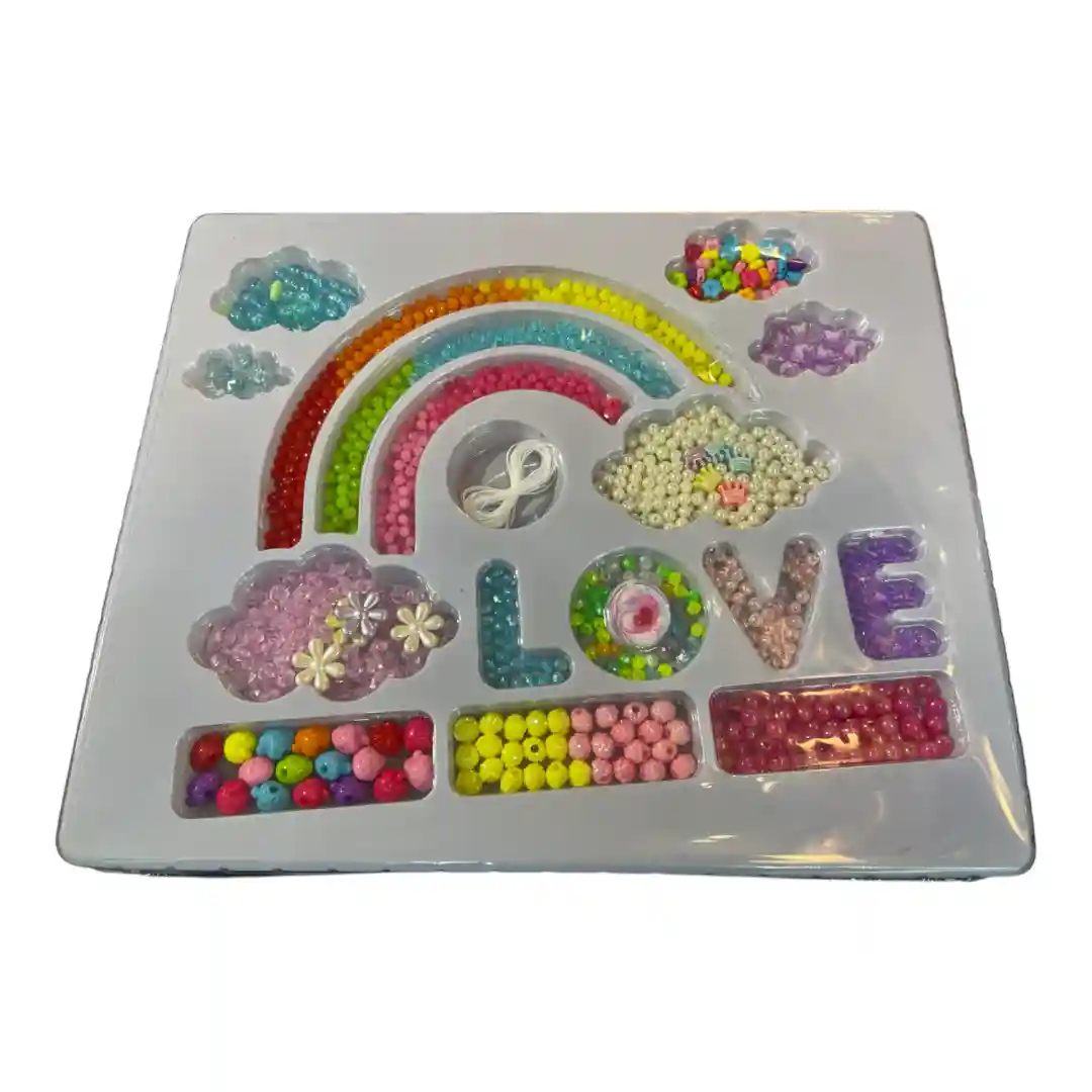 • Descripción del Contenido: El set incluye una gran variedad de cuentas y abalorios de diferentes formas (corazones, estrellas, flores) y colores, así como cuentas tipo perla. También incluye hilo elástico para ensamblar las creaciones. La bandeja interna está organizada con un diseño de arcoíris y nubes, lo que hace que el contenido sea muy atractivo y fácil de usar.