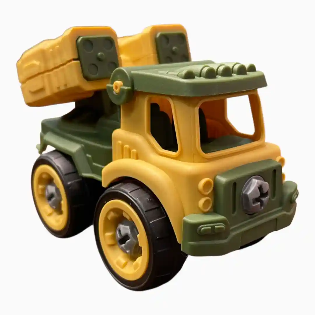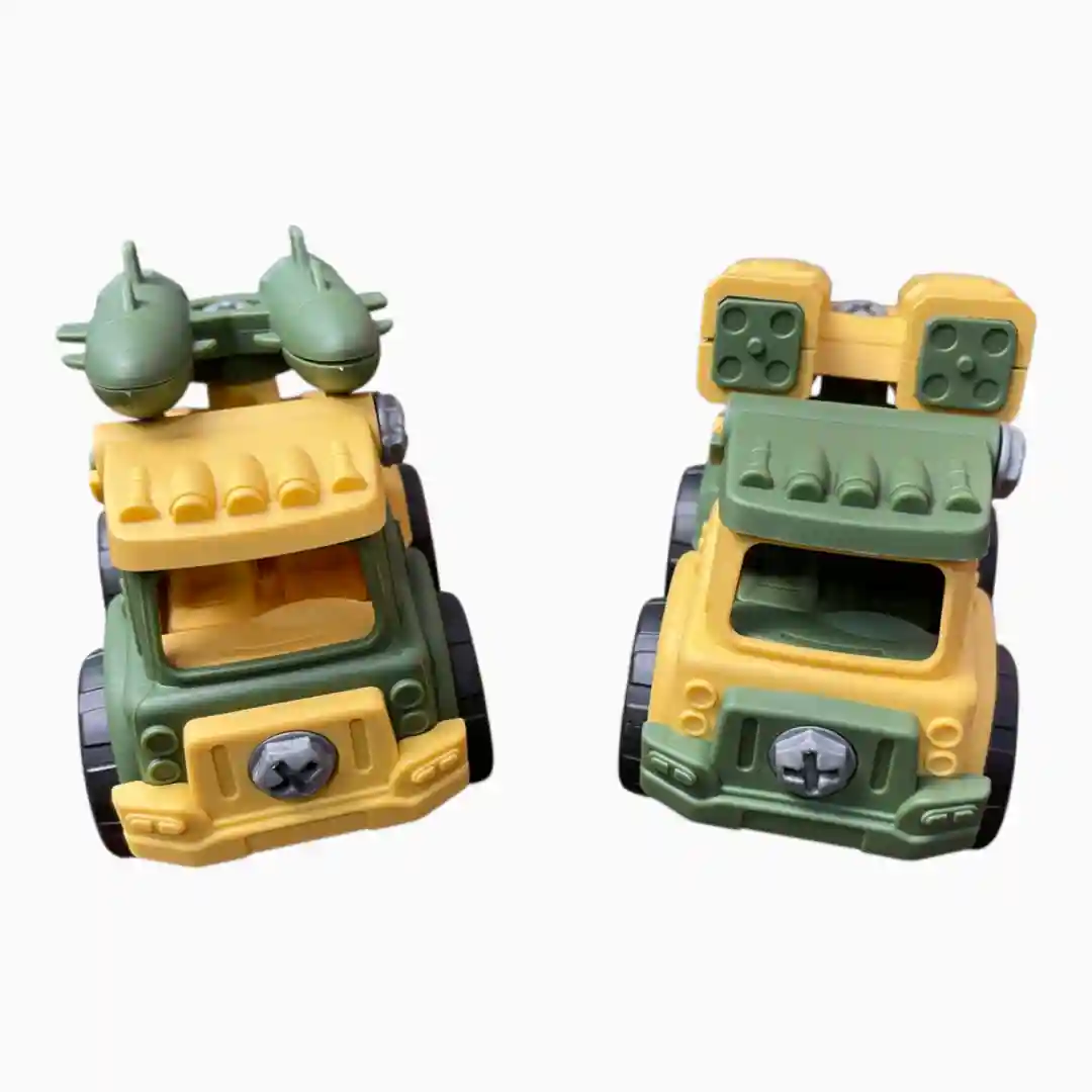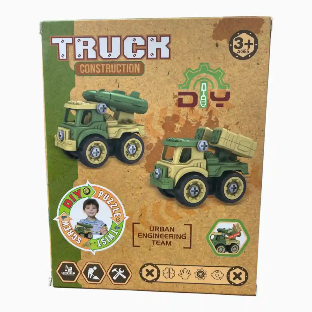 Kit de dos vehículos de construcción (ej. camión militar/lanzador de misiles y camión de obras) que se pueden ensamblar y desensamblar utilizando un destornillador de juguete incluido, fomentando el juego «Hazlo Tú Mismo» (DIY).