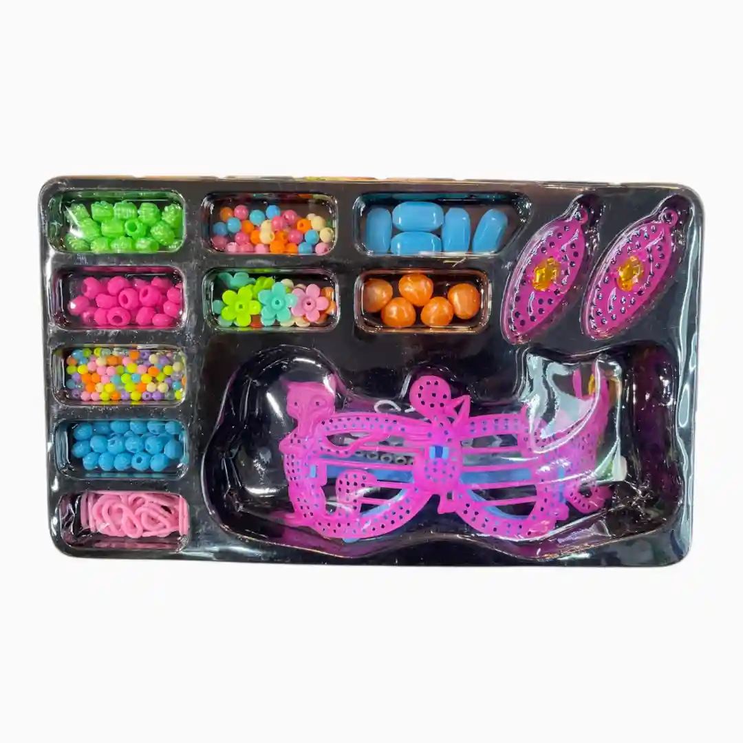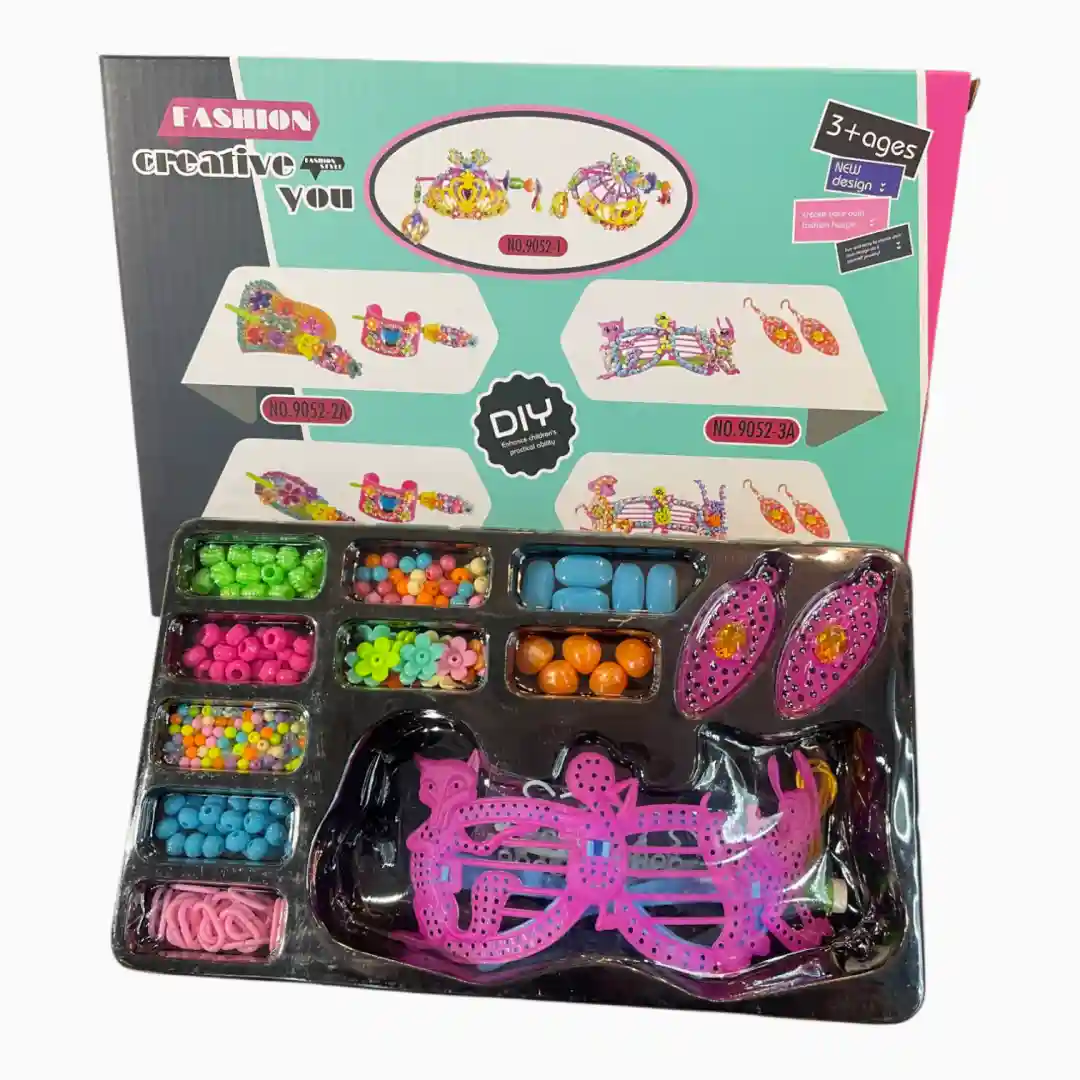 - Descripción del Contenido: El set incluye una variedad de cuentas y abalorios de diferentes formas y colores, bases para crear pasadores, pinzas o diademas (según el modelo), gomas elásticas, y otros elementos de adorno. Todo lo necesario para que los niños puedan armar sus propios accesorios para el cabello de manera divertida y sencilla.