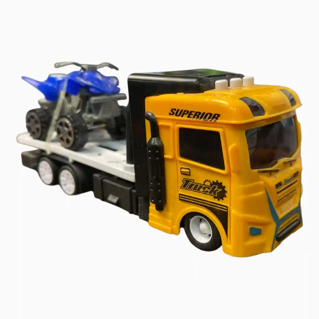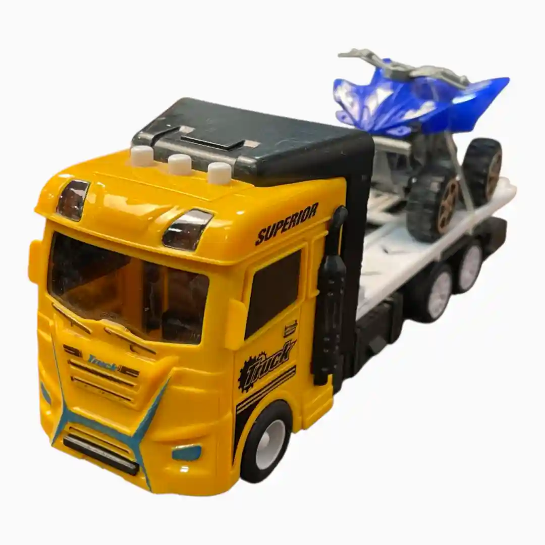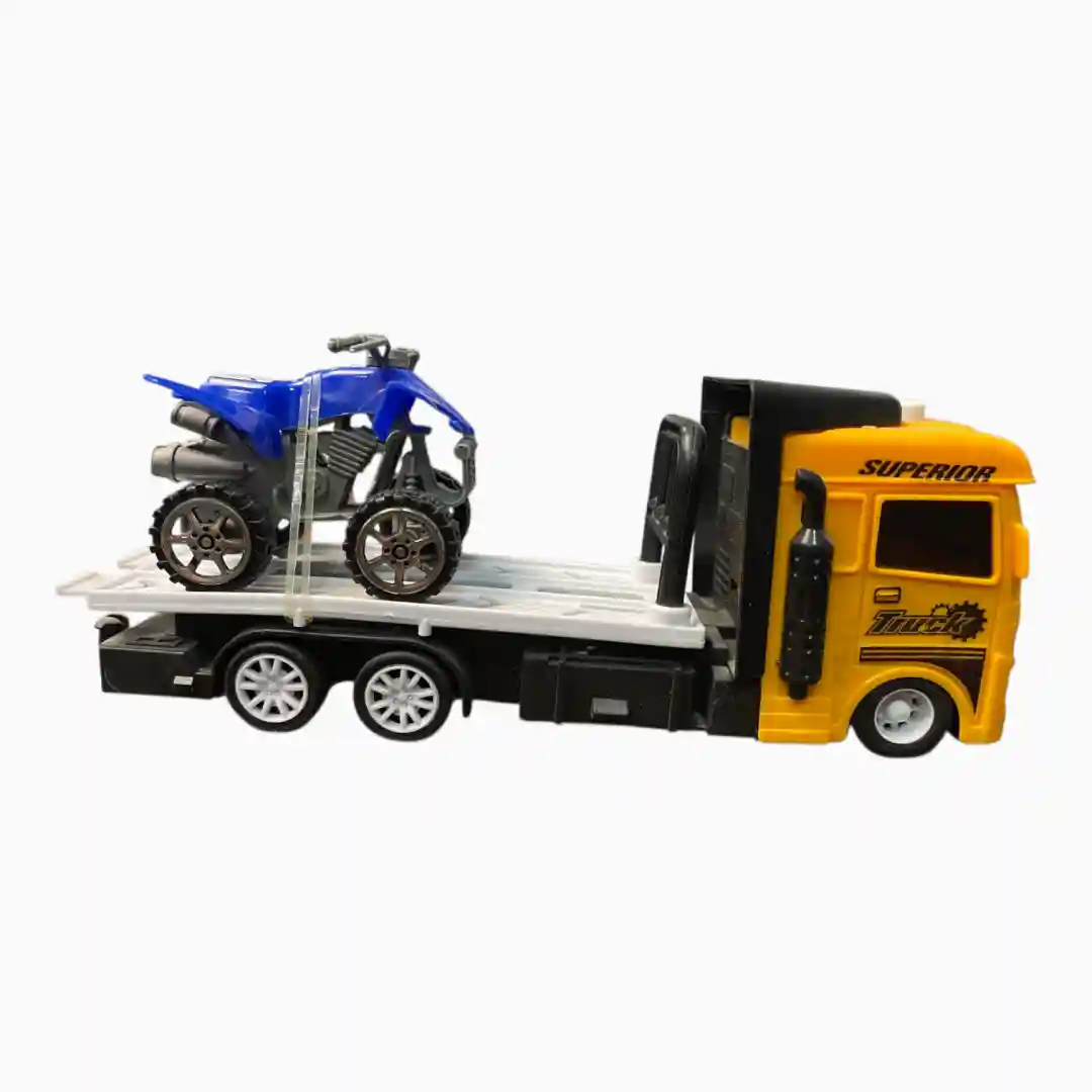 - Paleta de Colores: Tractocamión en un llamativo color Amarillo Superior con cabina negra. Remolque de plataforma en color blanco o gris, y la cuatrimoto en azul vibrante.