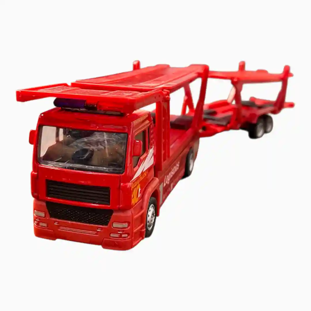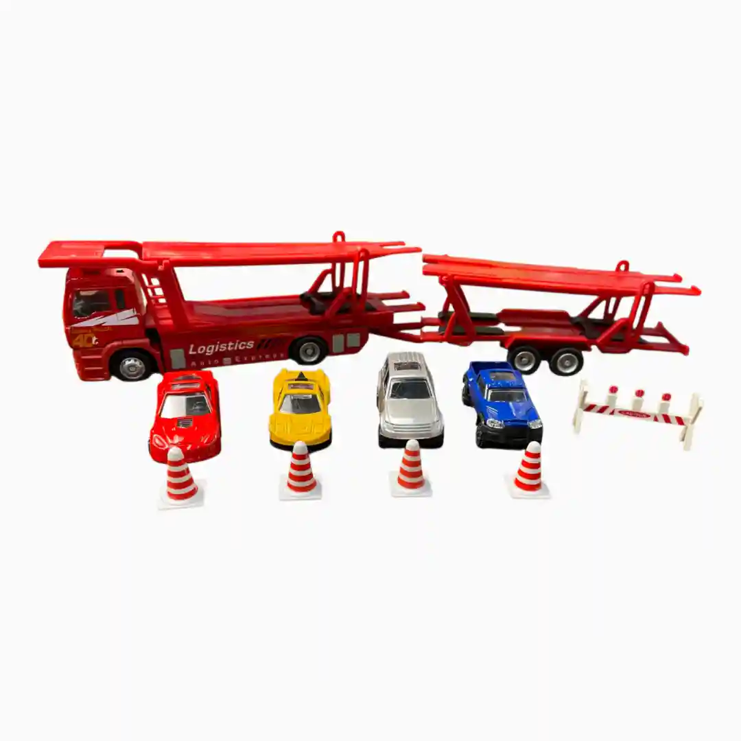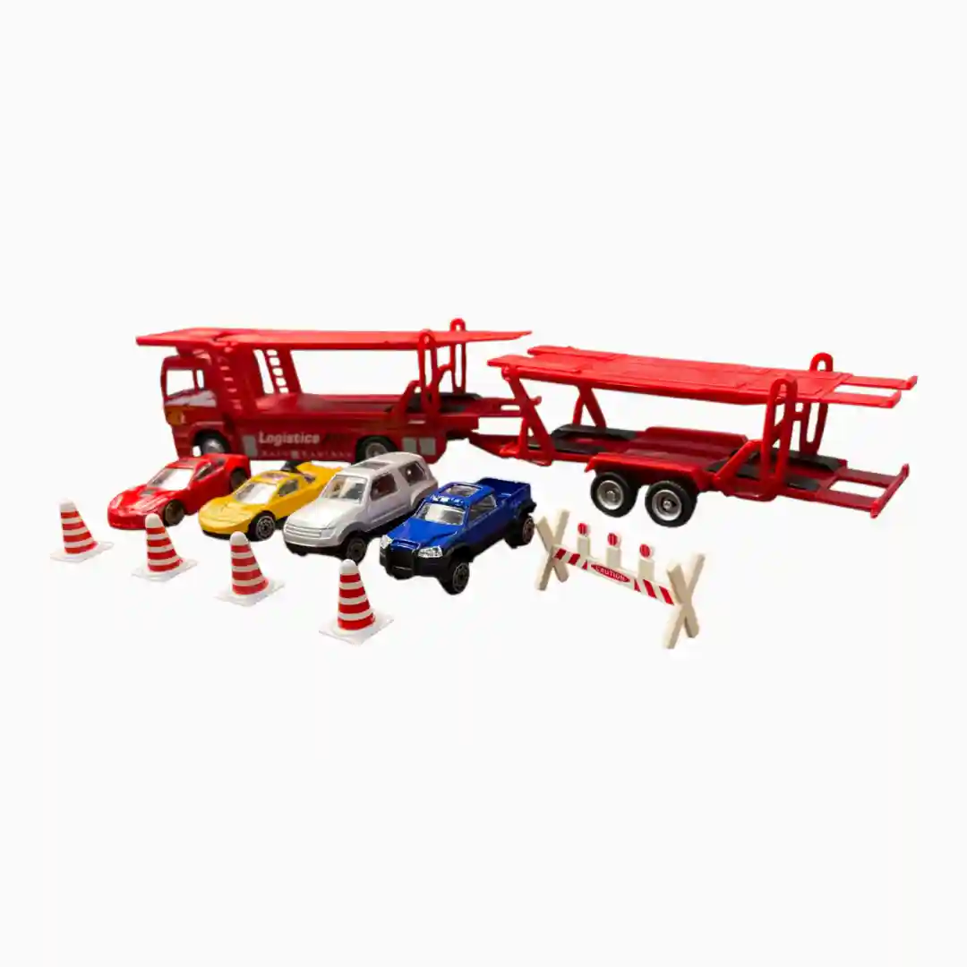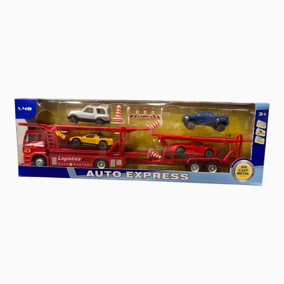 El MULA NIÑERA DOBLE PISO AUTO EXPRESS es un set de vehículos de carga y transporte a escala, ideal para el juego de simulación de logística y automovilismo. Combina vehículos de plástico de gran tamaño con carros de metal die-cast, ofreciendo un alto valor percibido.