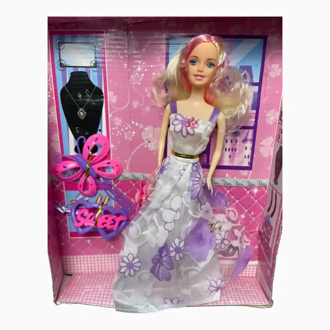 - Material: Plástico (Muñeca y Accesorios) y Tela (Vestido).