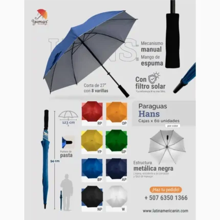 - Estructura: Metálica negra, con sistema Antibrisa que resiste vientos fuertes, evitando que el paraguas se voltee. Ofrece durabilidad y resistencia a la intemperie.