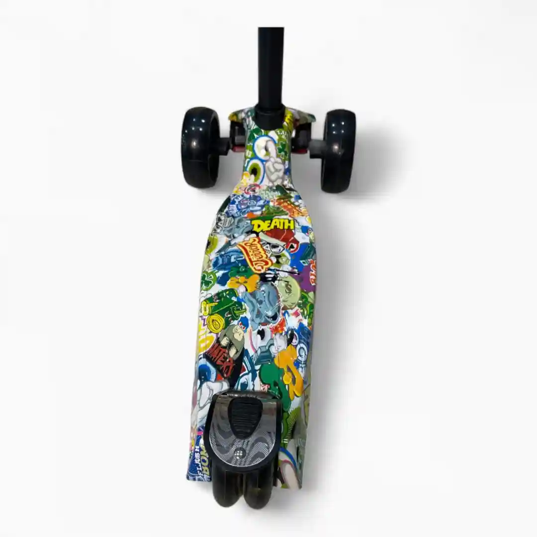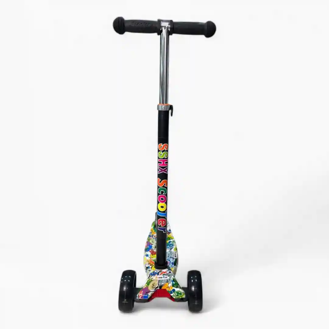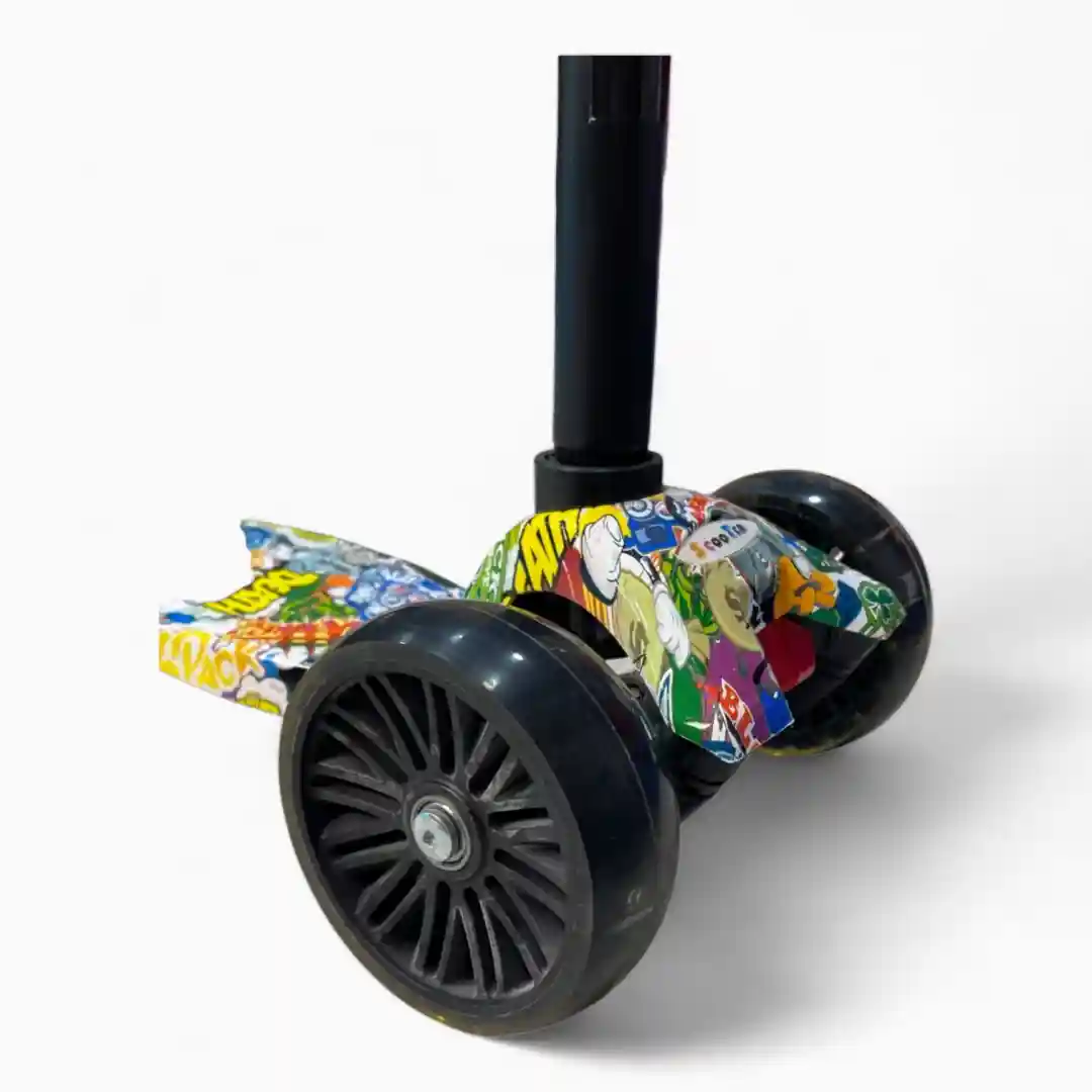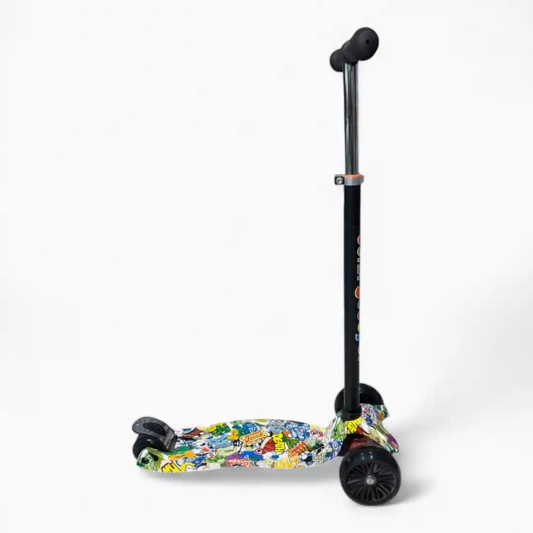 Lo que hace que este scooter sea ideal para los más pequeños es su diseño de tres ruedas: dos ruedas delanteras (una doble rueda frontal) y una rueda trasera. Esta configuración triangular proporciona una estabilidad superior a la de los modelos de dos ruedas, lo que reduce el riesgo de caídas y hace que el aprendizaje sea mucho más fácil y menos frustrante. El diseño es colorido y llamativo, con un manubrio alto y una plataforma para los pies (base) decorada con gráficos infantiles que capturan la imaginación.