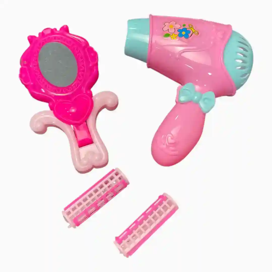 Conjunto de accesorios de juguete para peluquería, enfocado en el estilismo del cabello. El set incluye: un secador de pelo de juguete, un espejo de mano, un cepillo, pinzas y/o ganchos para el cabello (incluyendo diseños de flores), y rulos.