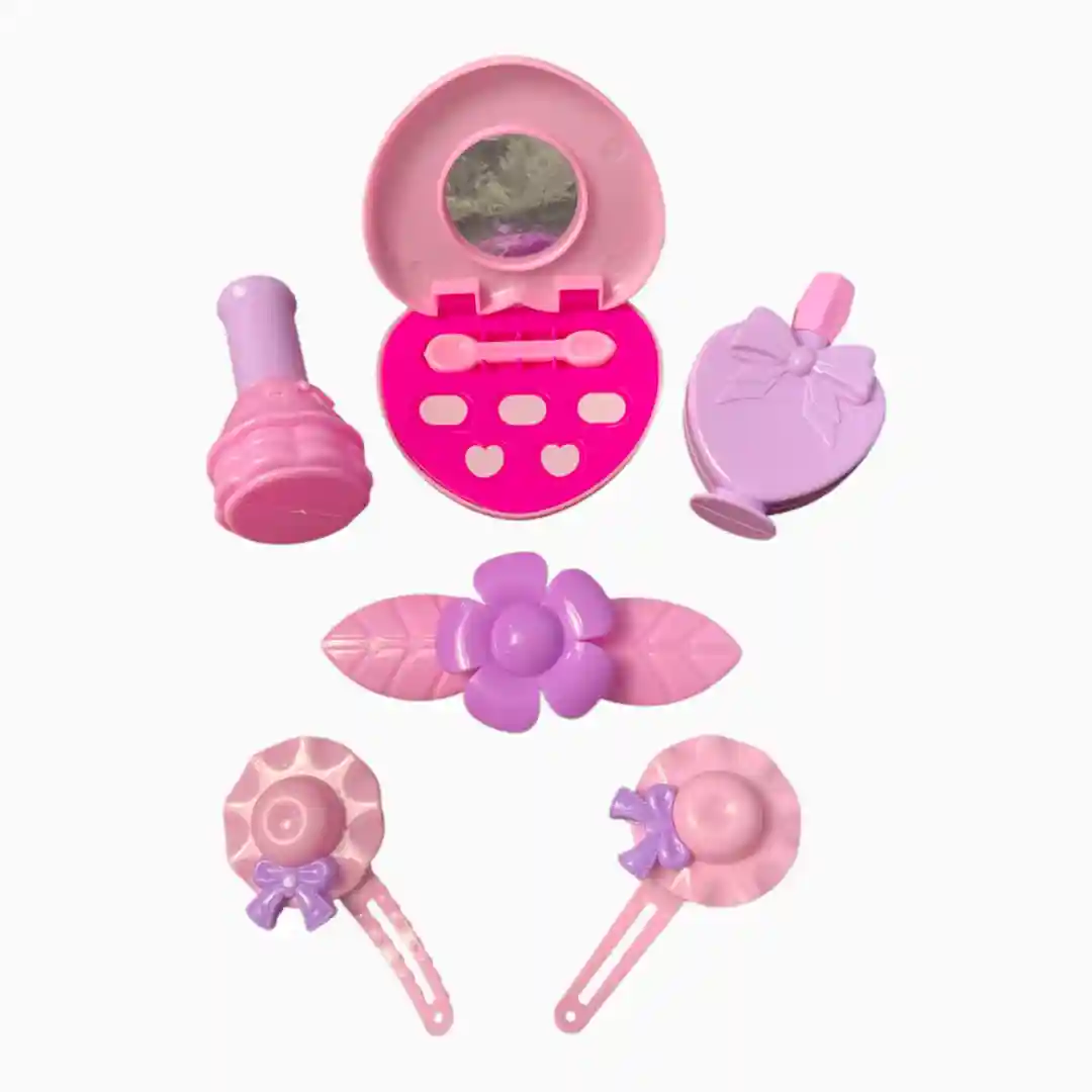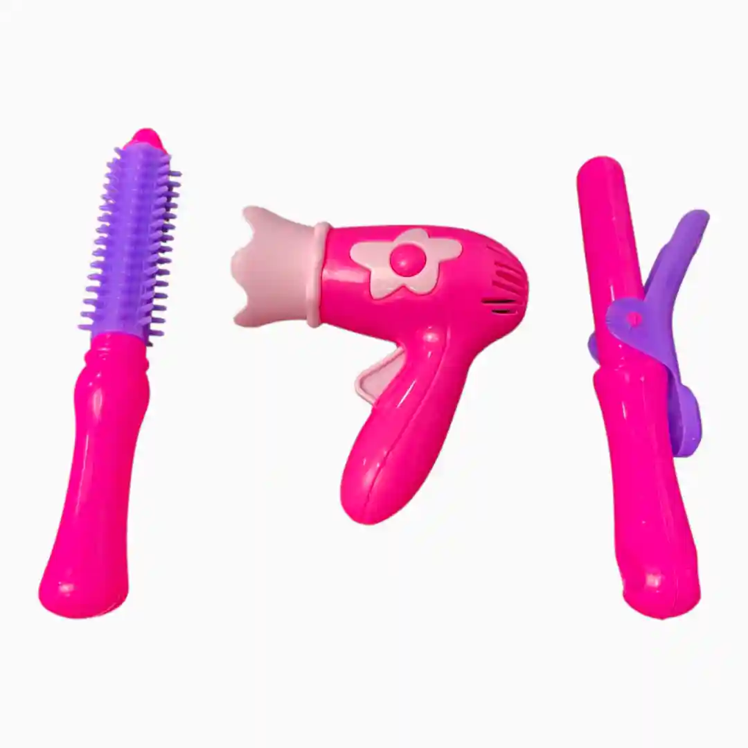 Un set de accesorios de belleza y peluquería de juguete, fabricados en plástico, con diversas piezas que simulan herramientas de estilismo y maquillaje. El set incluye secador de pelo, peines, espejos, pinzas, rulos y artículos que simulan maquillaje o perfume.