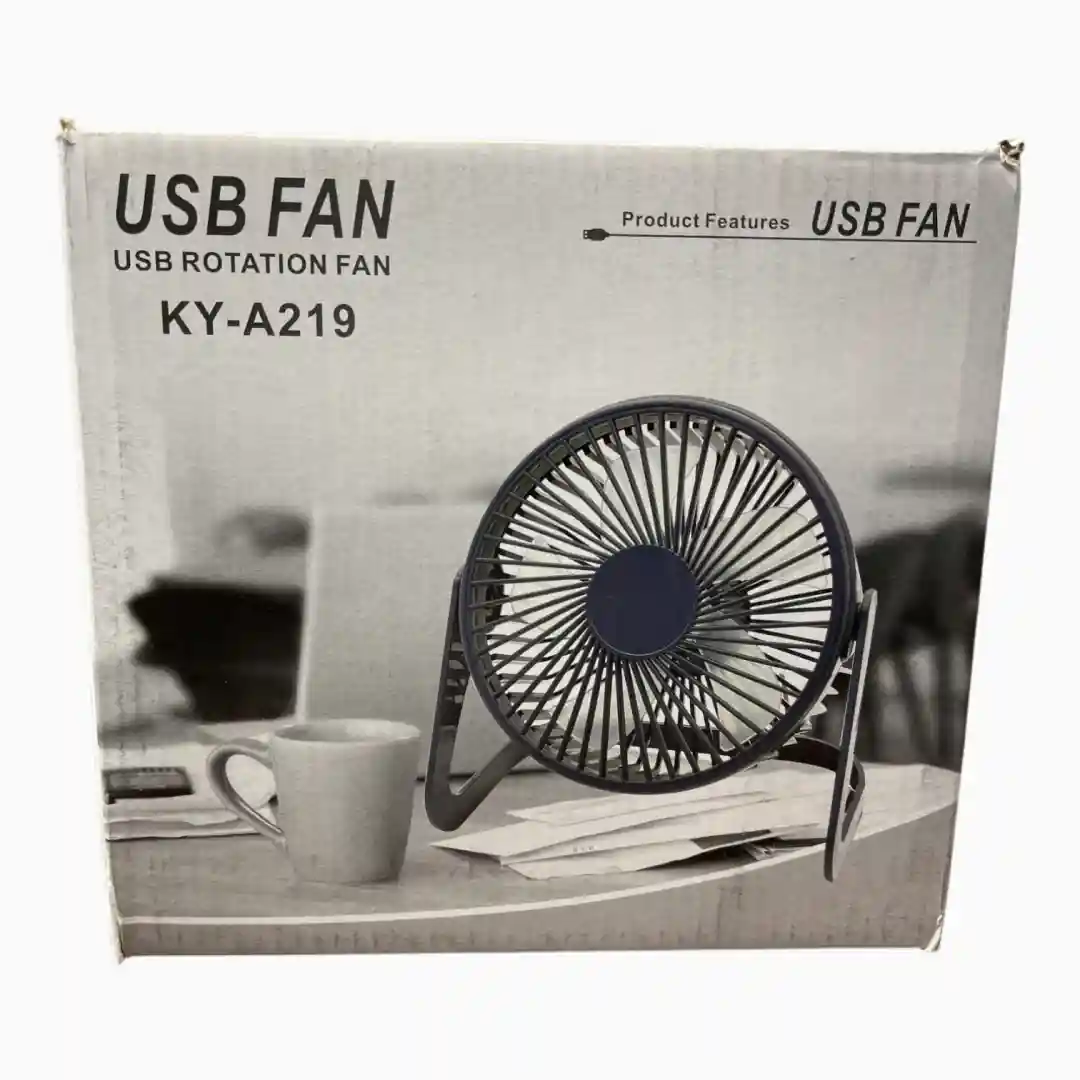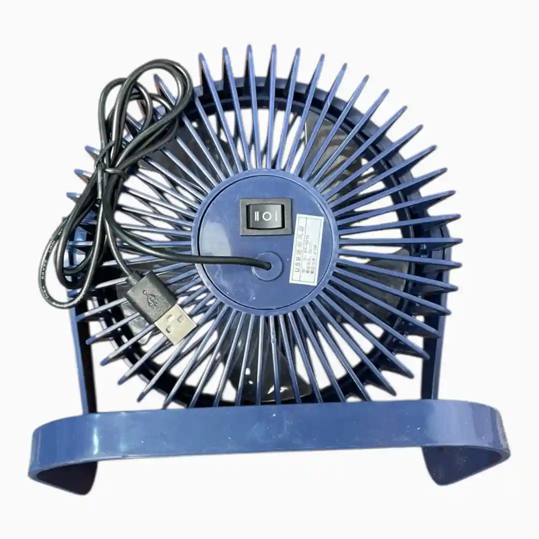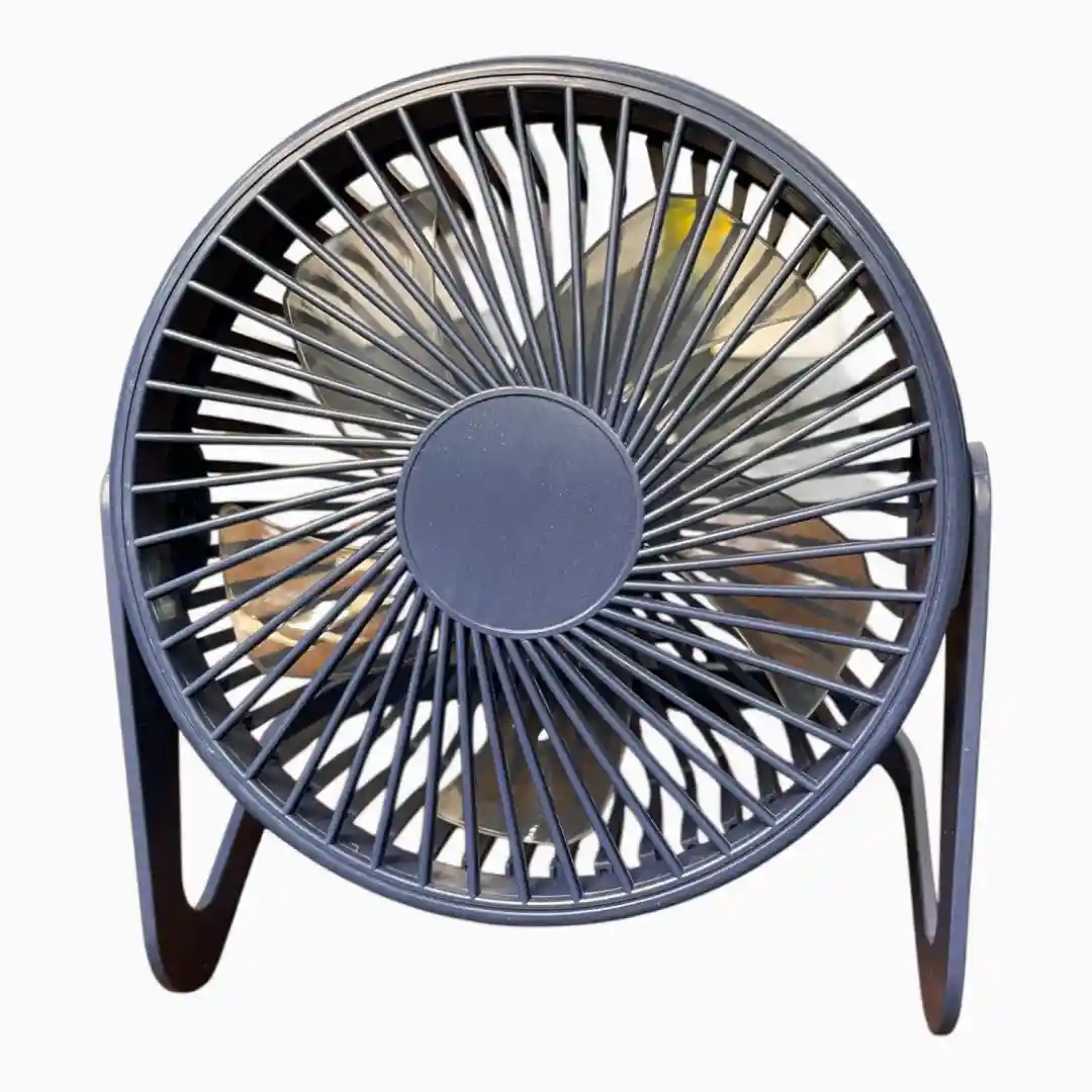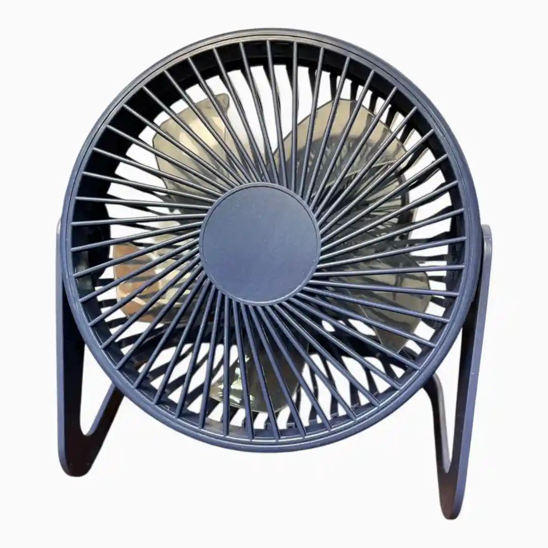 Ventilador de escritorio ultracompacto y alámbrico, diseñado para ofrecer una solución de enfriamiento personal y constante. Se conecta a cualquier puerto USB (ordenador, power bank, adaptador de pared) y cuenta con una función de iluminación LED de bajo consumo, ideal para usar en espacios de trabajo o estudio.