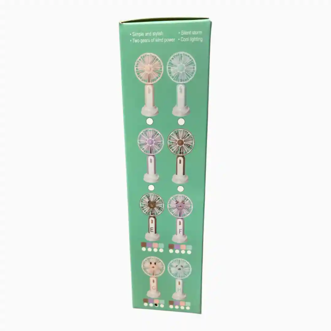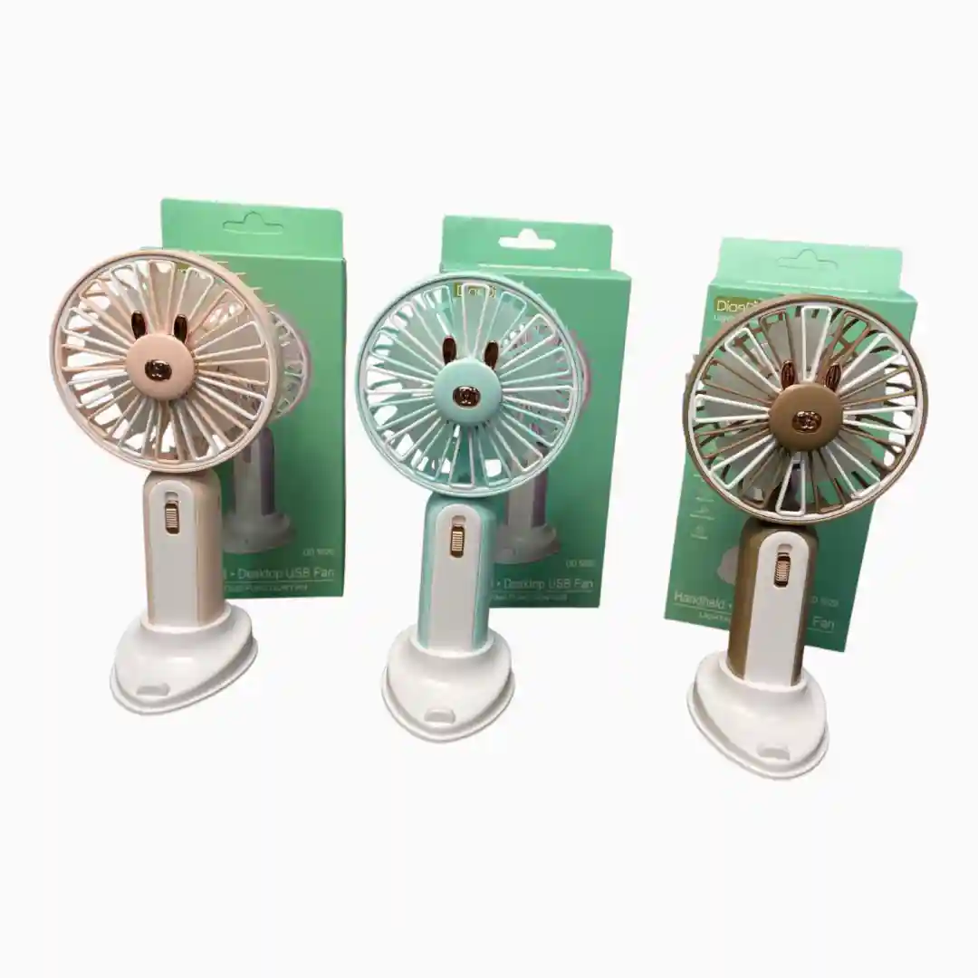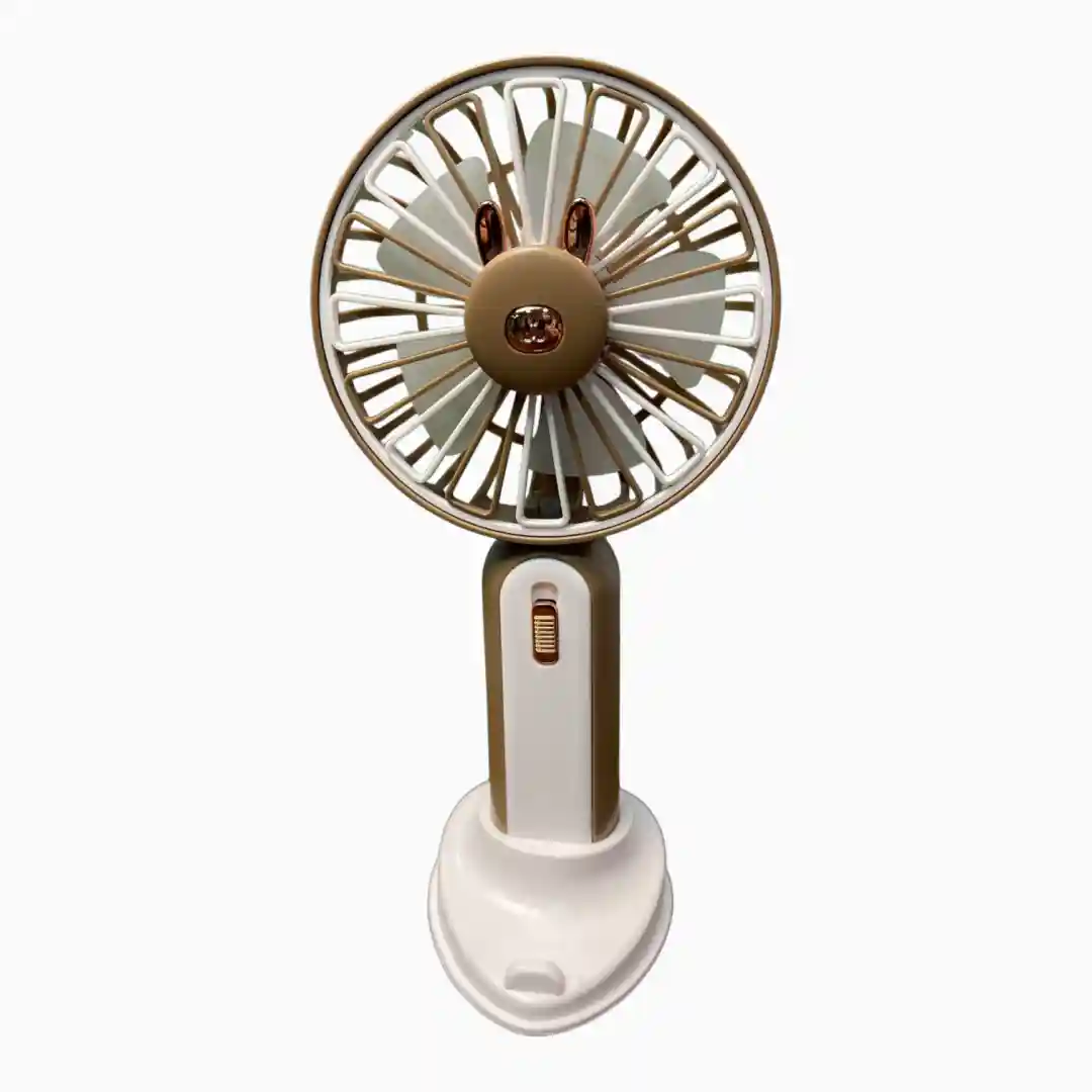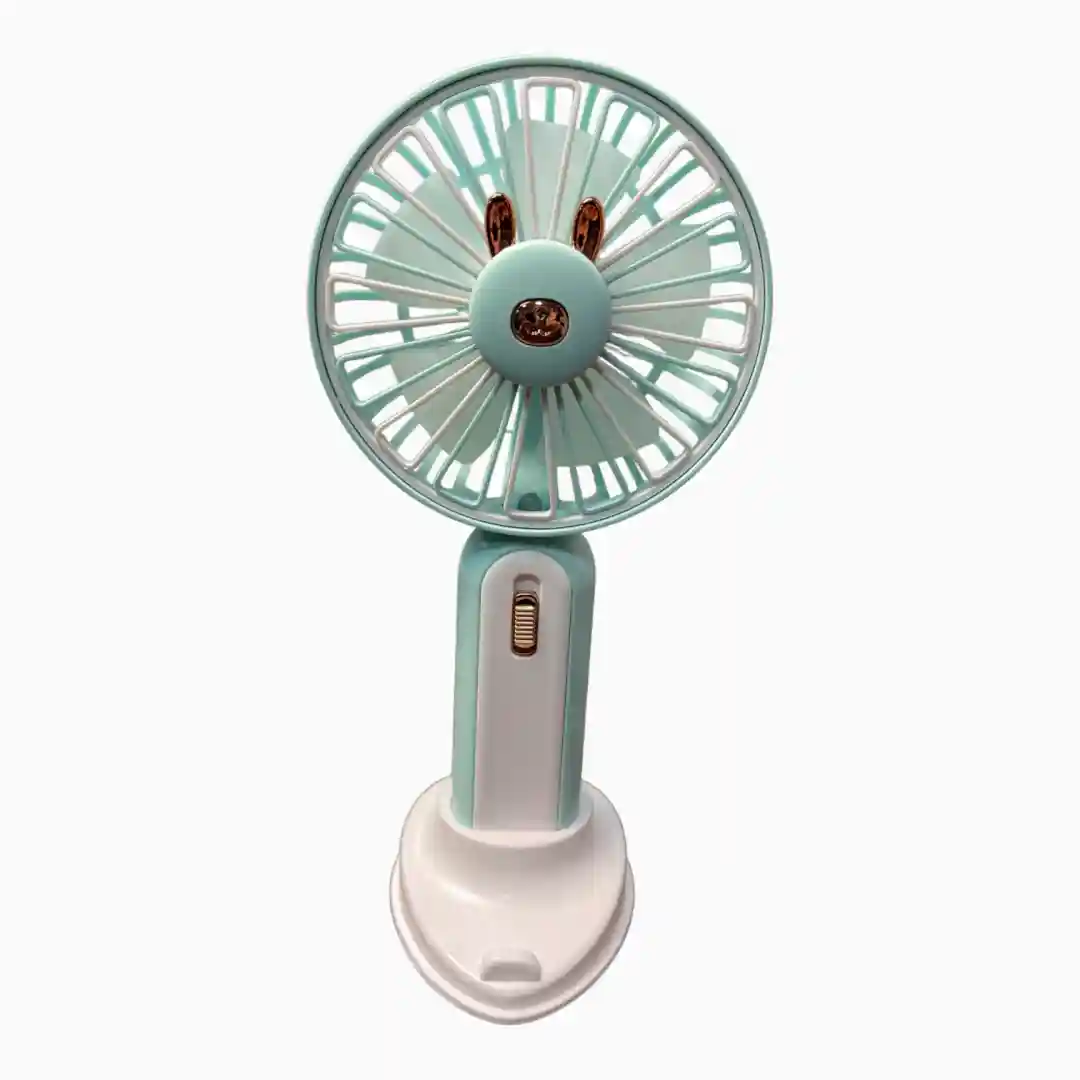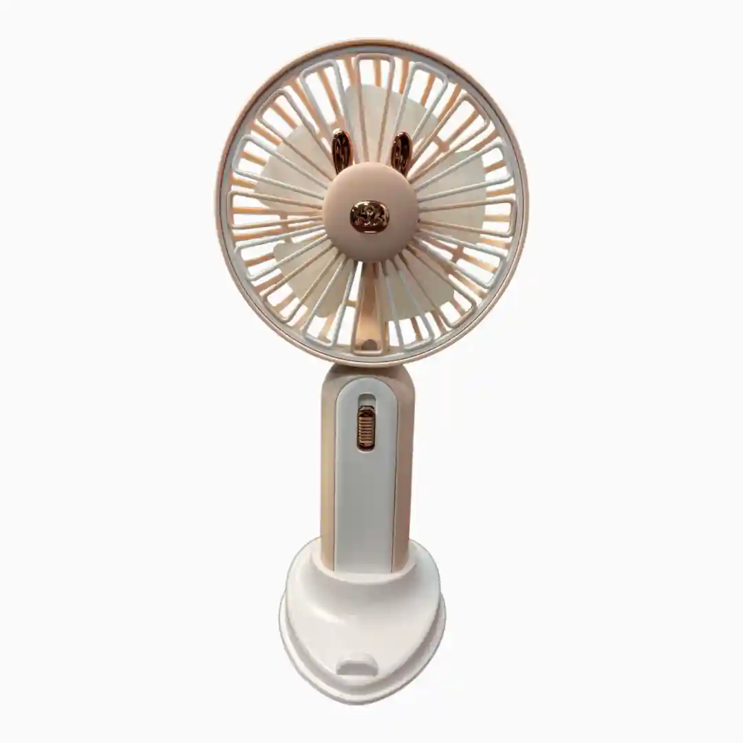 Ventilador personal de mano y de escritorio recargable, caracterizado por su base temática decorativa con forma de animal (Panda, Cerdito, o similar). Su diseño funcional lo hace ideal para el uso personal, combinando una brisa refrescante con una estética juvenil y atractiva.