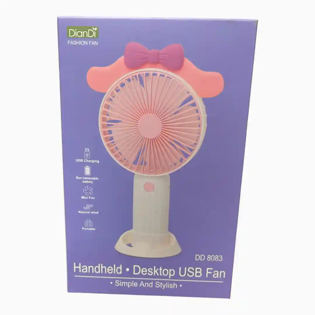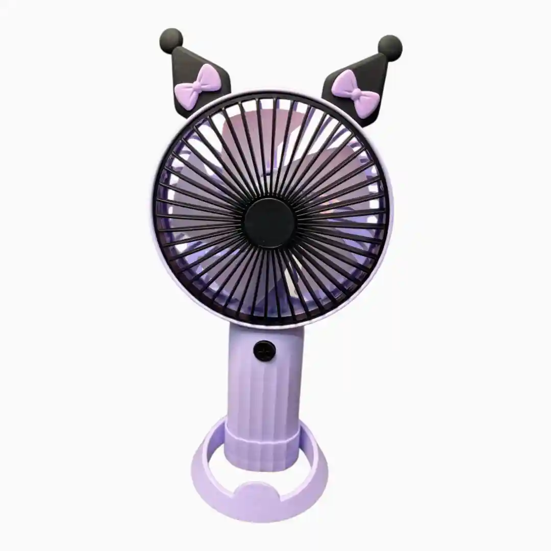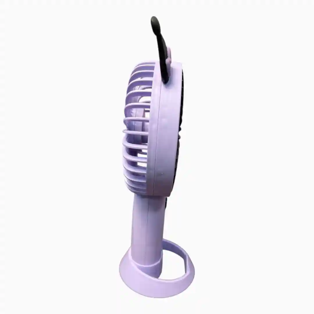 Ventilador personal de mano recargable, altamente atractivo para el público infantil y juvenil gracias a su diseño que incorpora figuras temáticas (ej. conejos, perros) en colores vibrantes. Ofrece una brisa refrescante con la versatilidad de poder usarse de mano o de escritorio gracias a su base desmontable.
