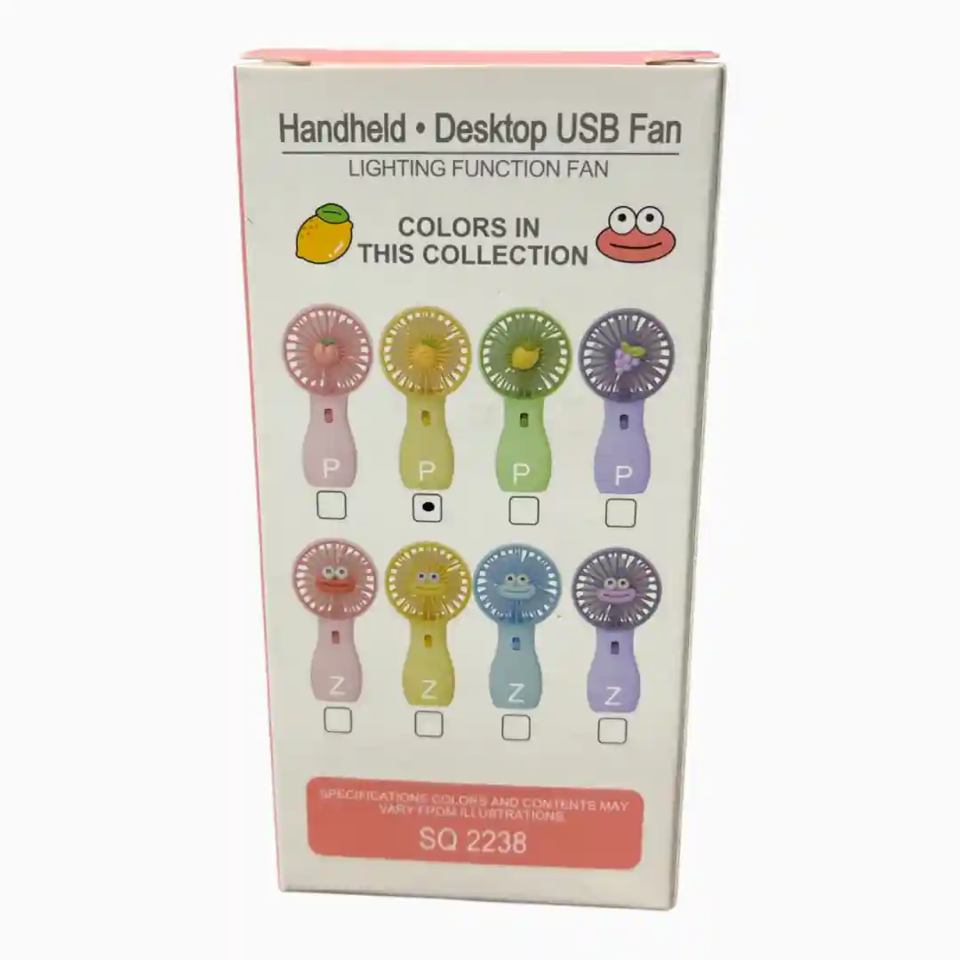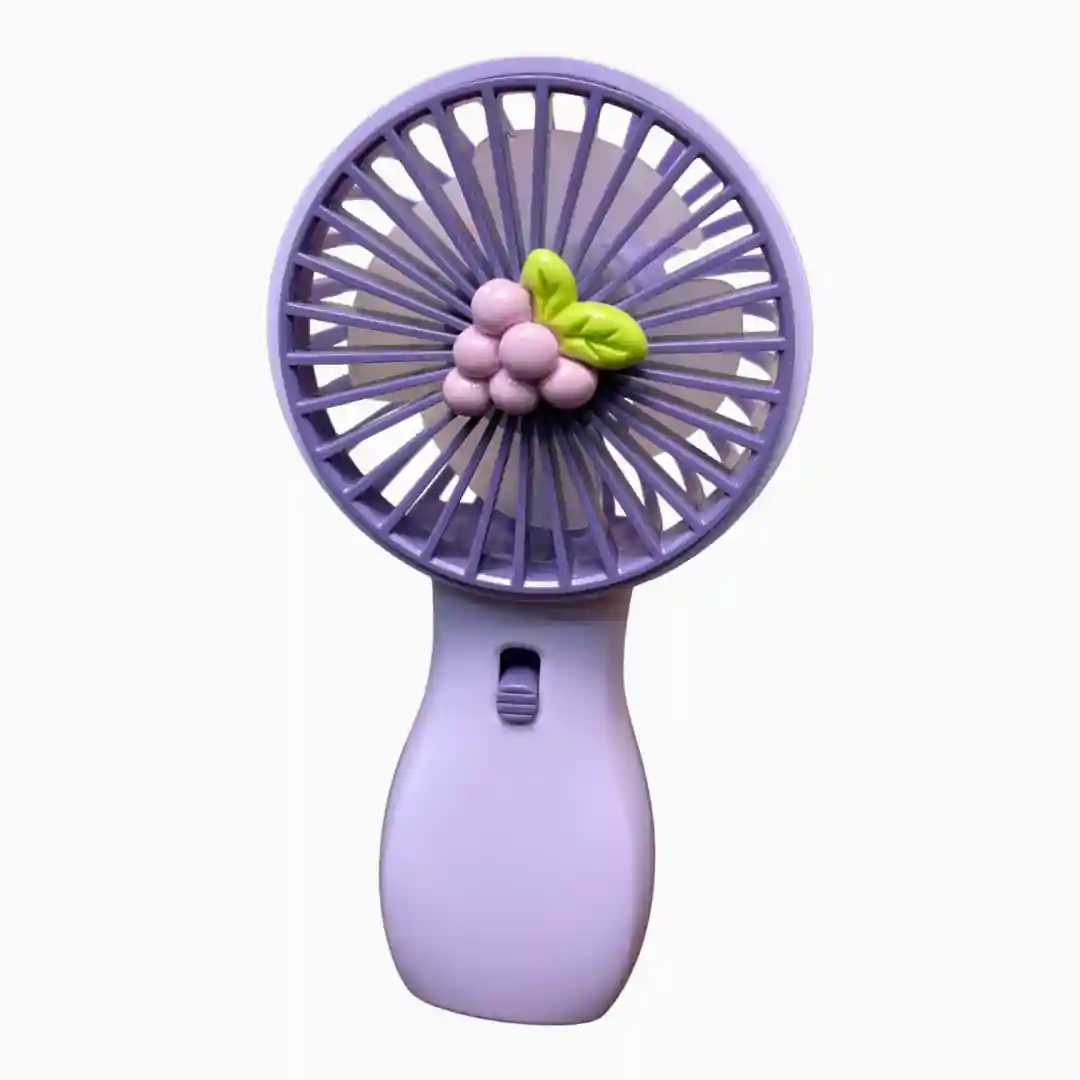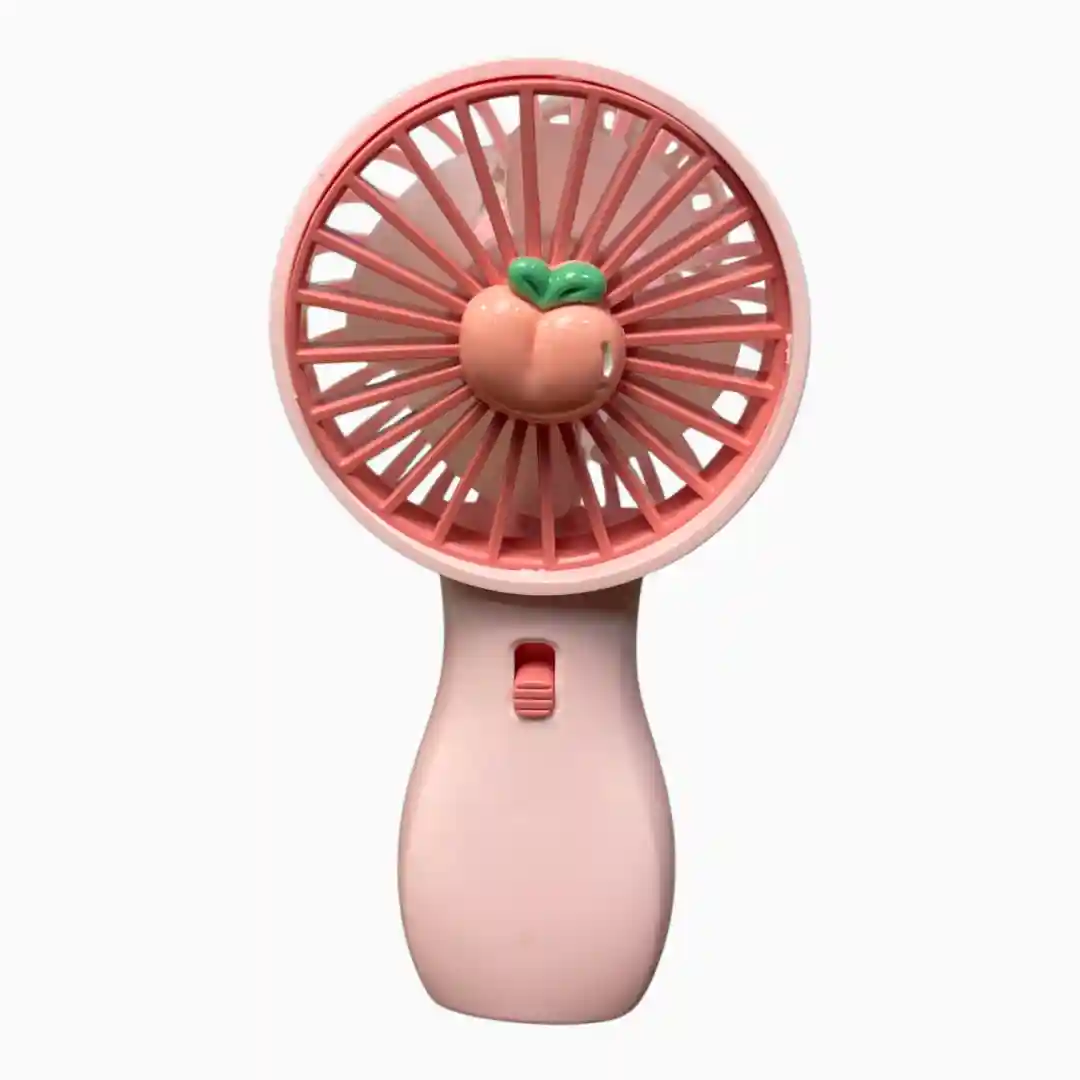 Ventilador personal recargable con diseño moderno y colores kawaii, ideal para proporcionar alivio refrescante en climas cálidos. Su diseño 2-en-1 permite usarlo de mano o colocarlo sobre un escritorio. Incluye un adorno temático de frutas en el centro de la rejilla, aumentando su atractivo visual.