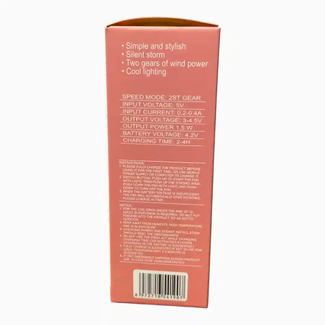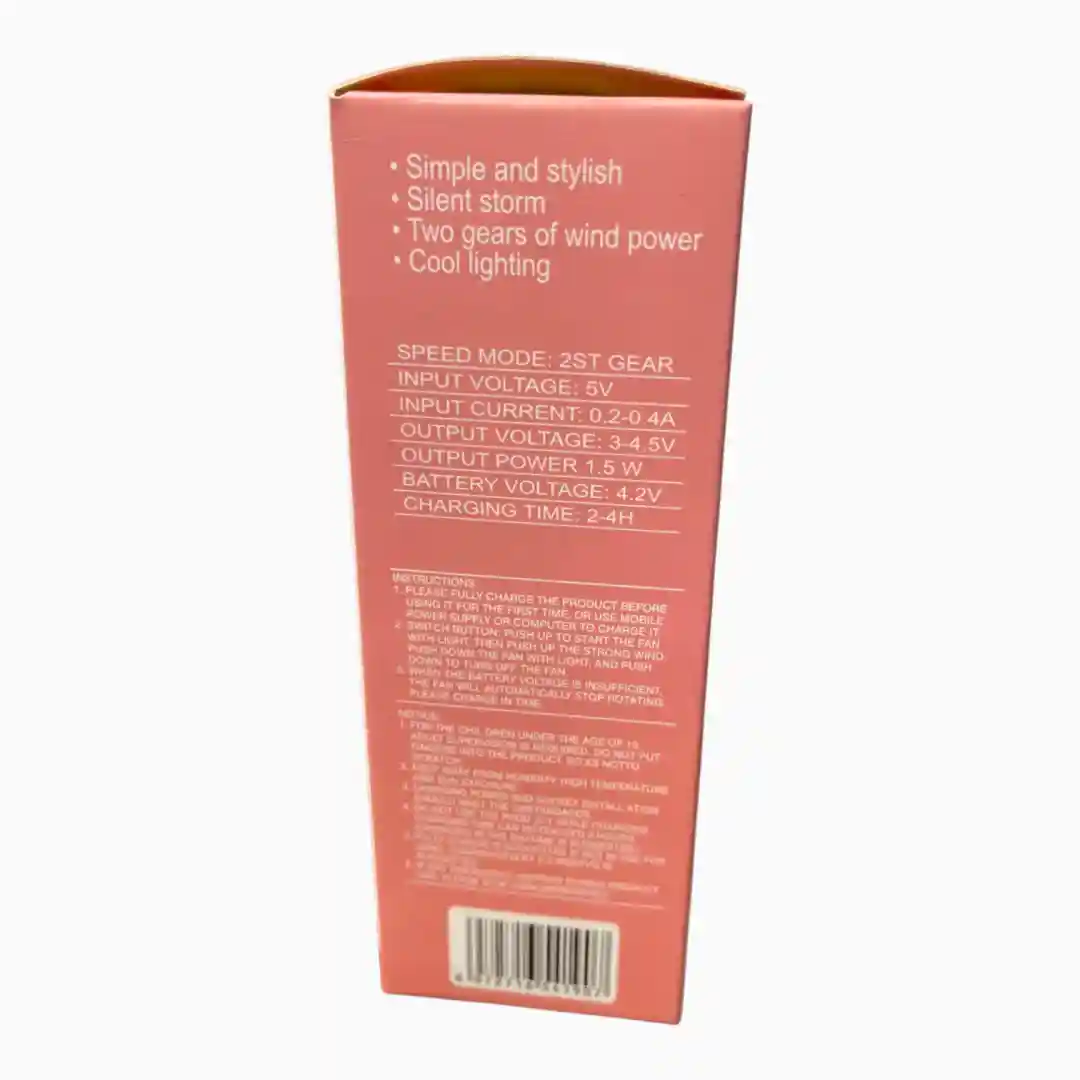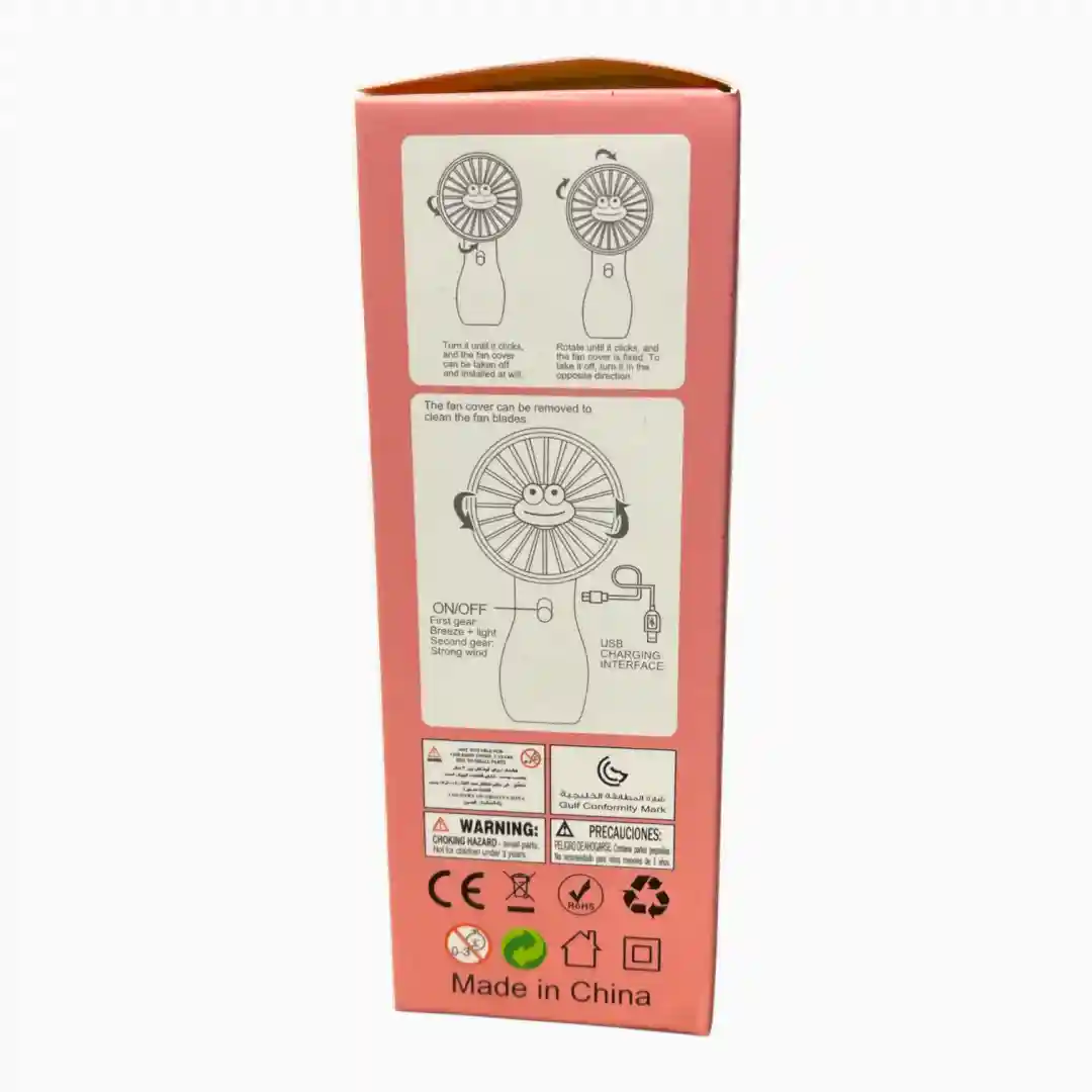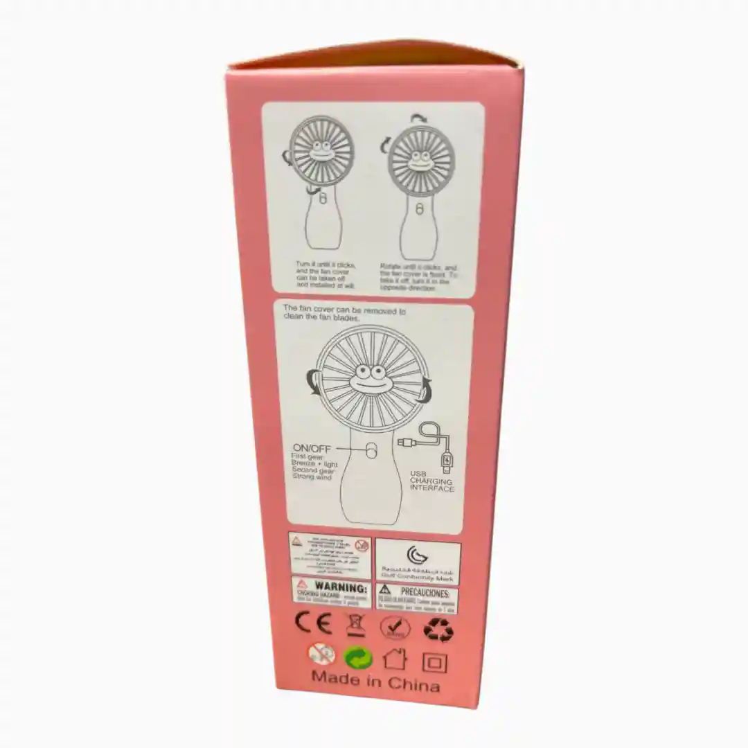 Ventilador personal recargable con diseño moderno y colores kawaii, ideal para proporcionar alivio refrescante en climas cálidos. Su diseño 2-en-1 permite usarlo de mano o colocarlo sobre un escritorio. Incluye un adorno temático de frutas en el centro de la rejilla, aumentando su atractivo visual.